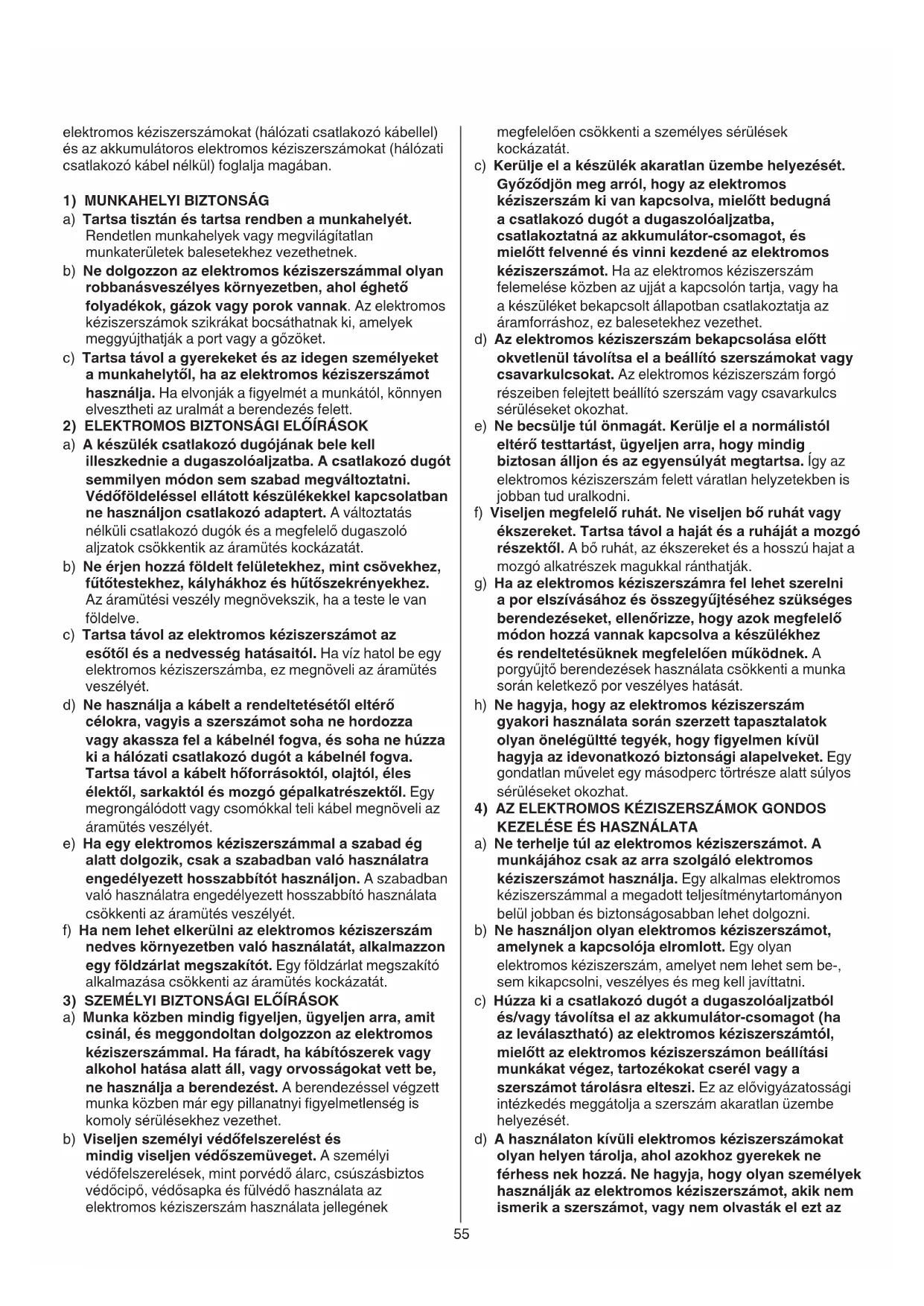 a) Munka kozben mindig figyeljen, ugyeljenarra, amit csinal, es meggondoltan dolgozzon az elektromos keziszerszammal. Ha faradt, ha kabitoszerek vagy alcohol hatasa alatt all, vagy orvossagokat vett be, ne hasznalja a berendezest. A berendezessel vegzett munka kozben már egy pillanaty figyelmetlenseg is komoly serulsekhez gezethet.