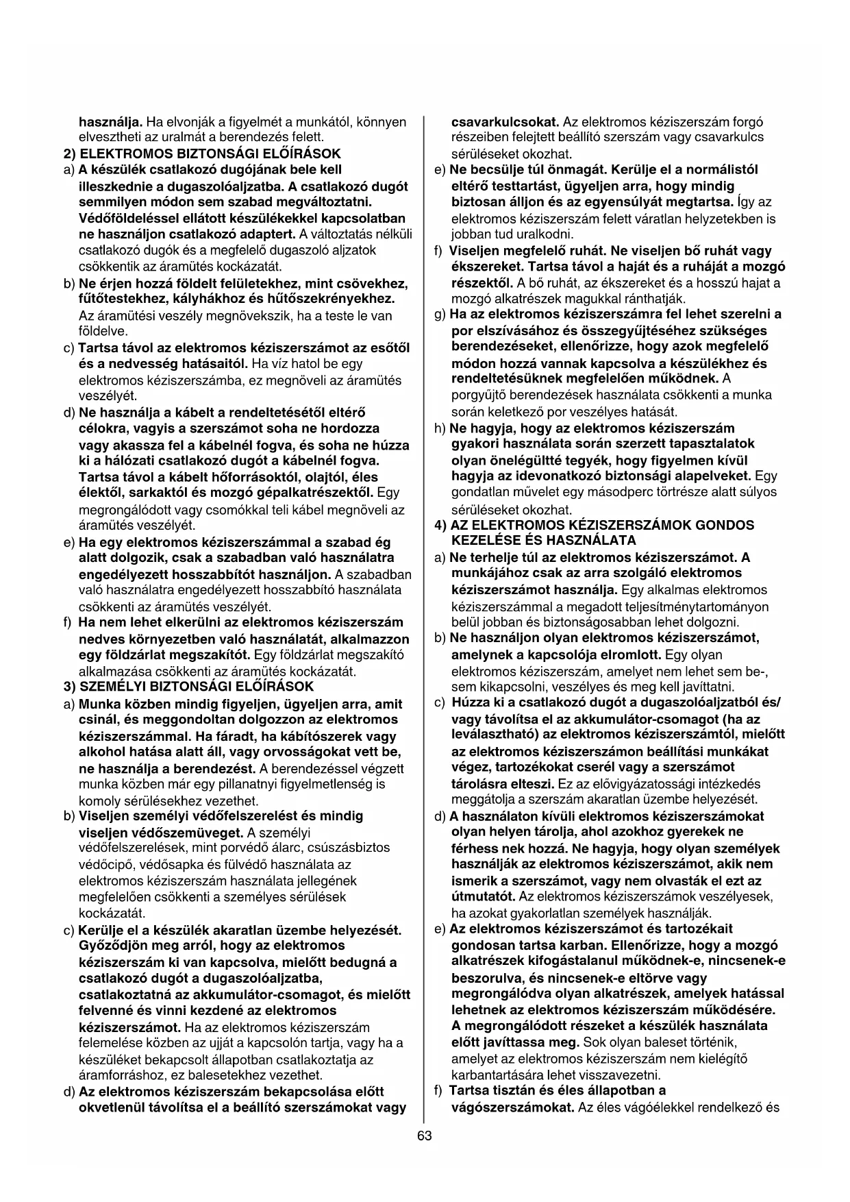 a) Tartsa tisztán és tartsa rendben a munkahelyét. Rendetlen munkahelyek vagy megvilágítatlan munkaterületek balesetekhez vezethetnek. b) Ne dolgozzon az elektromos kéziszerszámmal olyan robbanásveszélyes környezetben, ahol éghető folyadékok, gázok vagy porok vannak. Az elektromos kéziszerszámok szikrákat bocsáthatnak ki, amelyek meggyújthatják a port vagy a gőzöket. c) Tartsa távol a gyerekeket és az idegen személyeket a munkahelytől, ha az elektromos kéziszerszámot63 használja. Ha elvonják a figyelmét a munkától, könnyen elvesztheti az uralmát a berendezés felett.