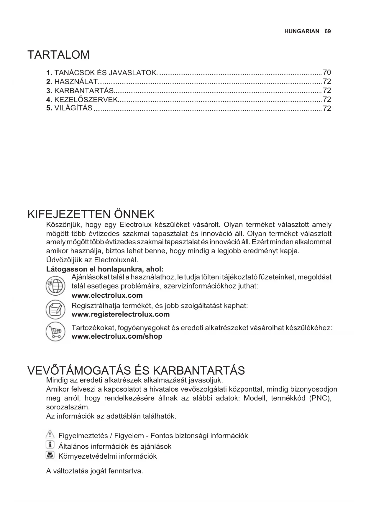 KIFEJEZETTEN ÖNNEK Köszönjük, hogy egy Electrolux készüléket vásárolt. Olyan terméket választott amely mögött több évtizedes szakmai tapasztalat és innováció áll. Olyan terméket választott amely mögött több évtizedes szakmai tapasztalat és innováció áll. Ezért minden alkalommal amikor használja, biztos lehet benne, hogy mindig a legjobb eredményt kapja. Üdvözöljük az Electroluxnál. Látogasson el honlapunkra, ahol: Ajánlásokat talál a használathoz, le tudja tölteni tájékoztató füzeteinket, megoldást talál esetleges problémáira, szervizinformációkhoz juthat: www.electrolux.com Regisztrálhatja termékét, és jobb szolgáltatást kaphat: www.registerelectrolux.com Tartozékokat, fogyóanyagokat és eredeti alkatrészeket vásárolhat készülékéhez: www.electrolux.com/shop VEVŐTÁMOGATÁS ÉS KARBANTARTÁS Mindig az eredeti alkatrészek alkalmazását javasoljuk. Amikor felveszi a kapcsolatot a hivatalos vevőszolgálati központtal, mindig bizonyosodjon meg arról, hogy rendelkezésére állnak az alábbi adatok: Modell, termékkód (PNC), sorozatszám. Az információk az adattáblán találhatók. Figyelmeztetés / Figyelem - Fontos biztonsági információk Általános információk és ajánlások Környezetvédelmi információk A változtatás jogát fenntartva.70 www.electrolux.com