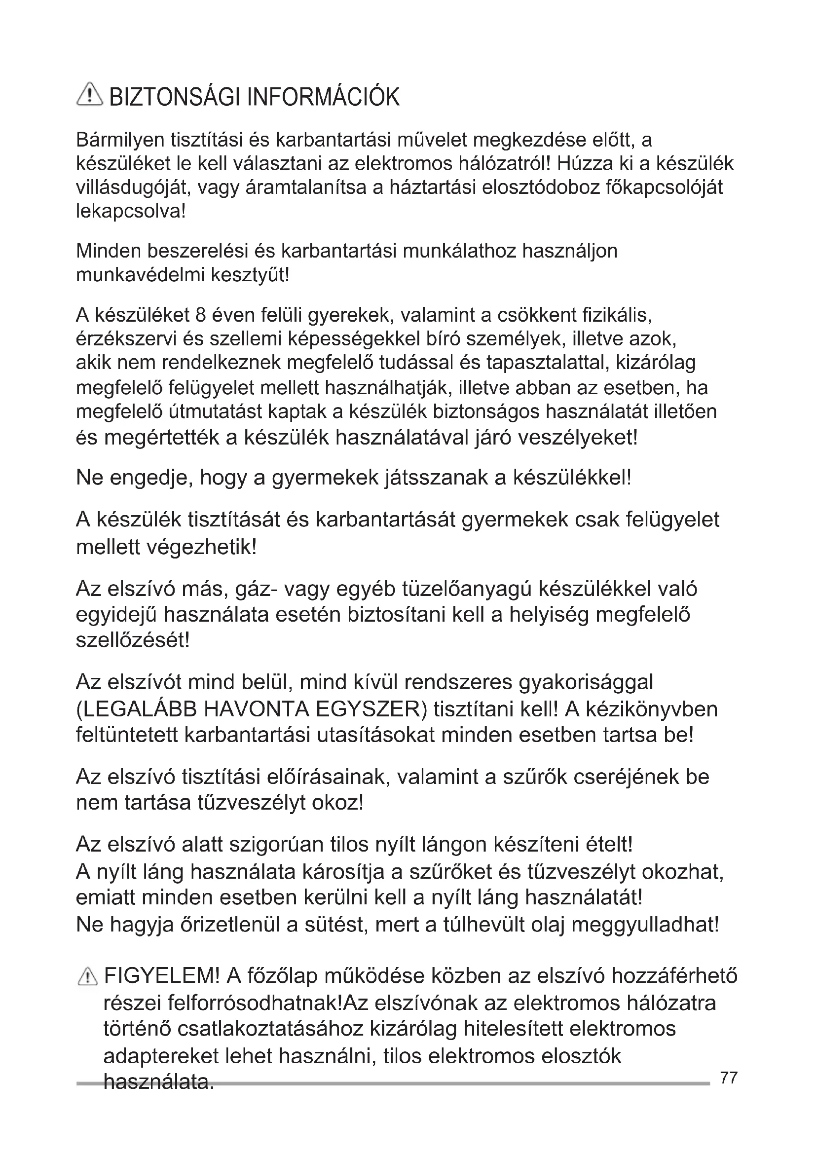 Bármilyentisztításiéskarbantartásiműveletmegkezdéseelőtt,a készüléketlekellválasztaniazelektromoshálózatról!Húzzakiakészülék villásdugóját,vagyáramtalanítsaaháztartásielosztódobozfőkapcsolóját lekapcsolva! Minden beszerelési és karbantartási munkálathoz használjon munkavédelmikesztyűt! Akészüléket8évenfelüligyerekek,valamintacsökkentzikális, érzékszerviésszellemiképességekkelbírószemélyek,illetveazok, akiknemrendelkeznekmegfelelőtudássaléstapasztalattal,kizárólag megfelelőfelügyeletmelletthasználhatják,illetveabbanazesetben,ha megfelelőútmutatástkaptakakészülékbiztonságoshasználatátilletően ésmegértettékakészülékhasználatávaljáróveszélyeket! Neengedje,hogyagyermekekjátsszanakakészülékkel! Akészüléktisztításátéskarbantartásátgyermekekcsakfelügyelet mellettvégezhetik! Azelszívómás,gáz-vagyegyébtüzelőanyagúkészülékkelvaló egyidejűhasználataeseténbiztosítanikellahelyiségmegfelelő szellőzését! Azelszívótmindbelül,mindkívülrendszeresgyakorisággal (LEGALÁBBHAVONTAEGYSZER)tisztítanikell!Akézikönyvben feltüntetettkarbantartásiutasításokatmindenesetbentartsabe! Azelszívótisztításielőírásainak,valamintaszűrőkcseréjénekbe nemtartásatűzveszélytokoz! Azelszívóalattszigorúantilosnyíltlángonkészíteniételt! Anyíltlánghasználatakárosítjaaszűrőketéstűzveszélytokozhat, emiattmindenesetbenkerülnikellanyíltlánghasználatát! Nehagyjaőrizetlenülasütést,mertatúlhevültolajmeggyulladhat! FIGYELEM!Afőzőlapműködéseközbenazelszívóhozzáférhető részeifelforrósodhatnak!Azelszívónakazelektromoshálózatra történőcsatlakoztatásáhozkizárólaghitelesítettelektromos adaptereketlehethasználni,tiloselektromoselosztók használata.78