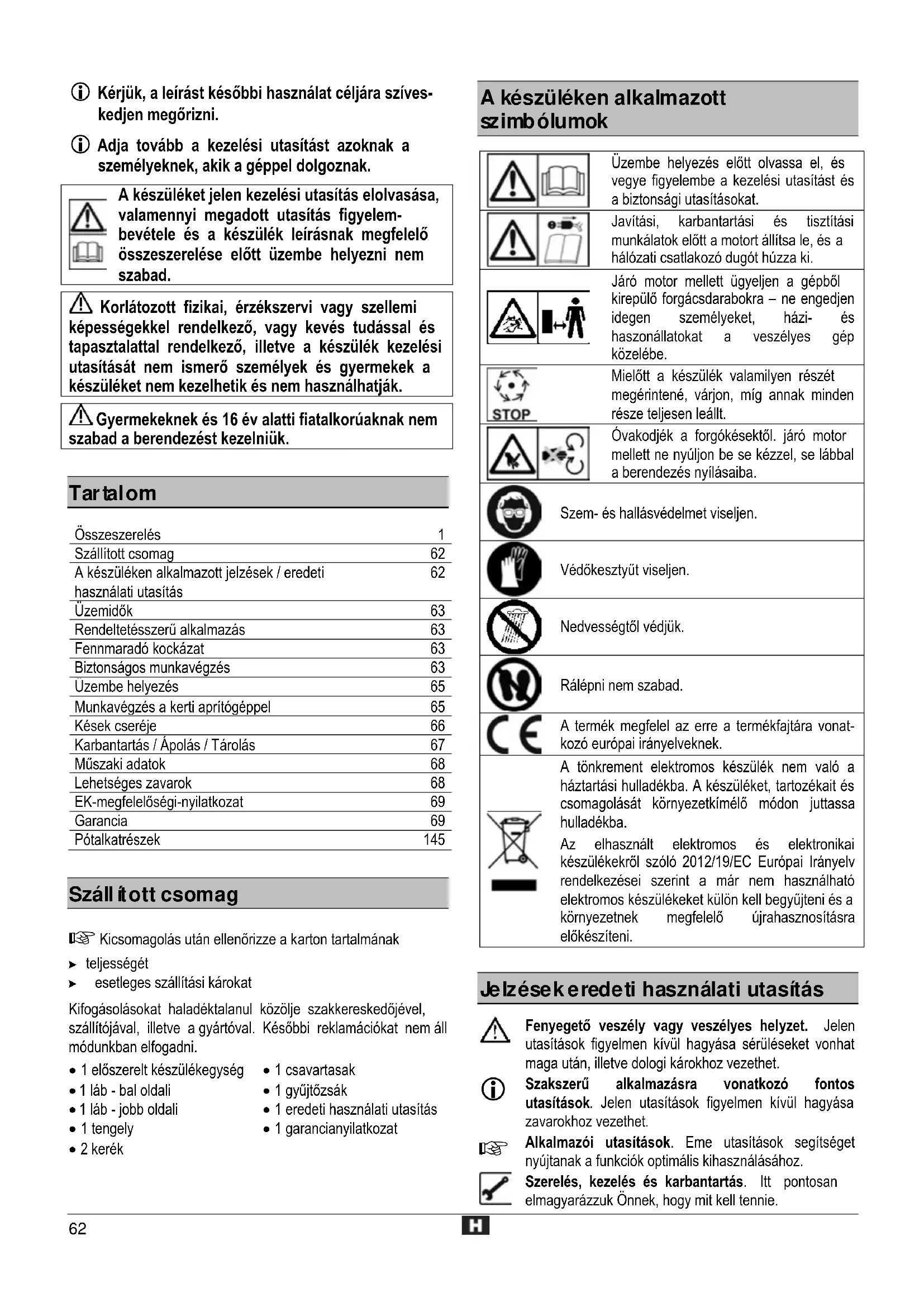 Huomioi mukana oleva takuuselvitys.62 Kérjük, a leírást későbbi használat céljára szíves- kedjen megőrizni. Adja tovább a kezelési utasítást azoknak a személyeknek, akik a géppel dolgoznak. A készüléket jelen kezelési utasítás elolvasása, valamennyi megadott utasítás figyelem- bevétele és a készülék leírásnak megfelelő összeszerelése előtt üzembe helyezni nem szabad.
