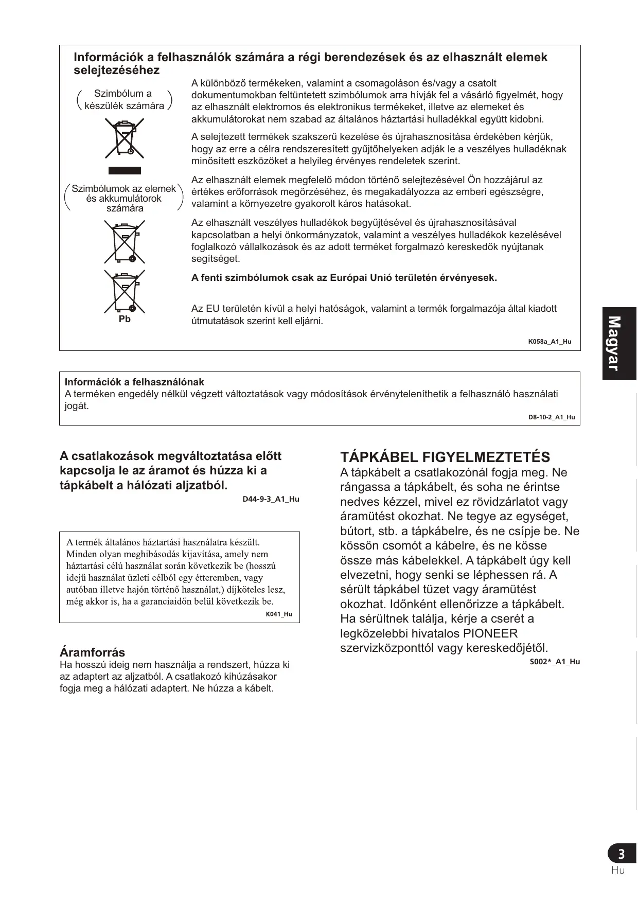 • Az Ön biztonsága érdekében ezzel az eszközzel csak a tartozék újratölthetĘ akkumulátorok tölthetĘk. Más típusú újratölthetĘ akkumulátorok vagy szárazelemek nem tölthetĘk. • Az újratölthetĘ akkumulátorokat újakra kell cserélni, ha töltés után már csak rövid ideig mĦködnek. Új akkumulátorokat az Önhöz legközelebb levĘ Pioneer szervizközponttól rendelhet.