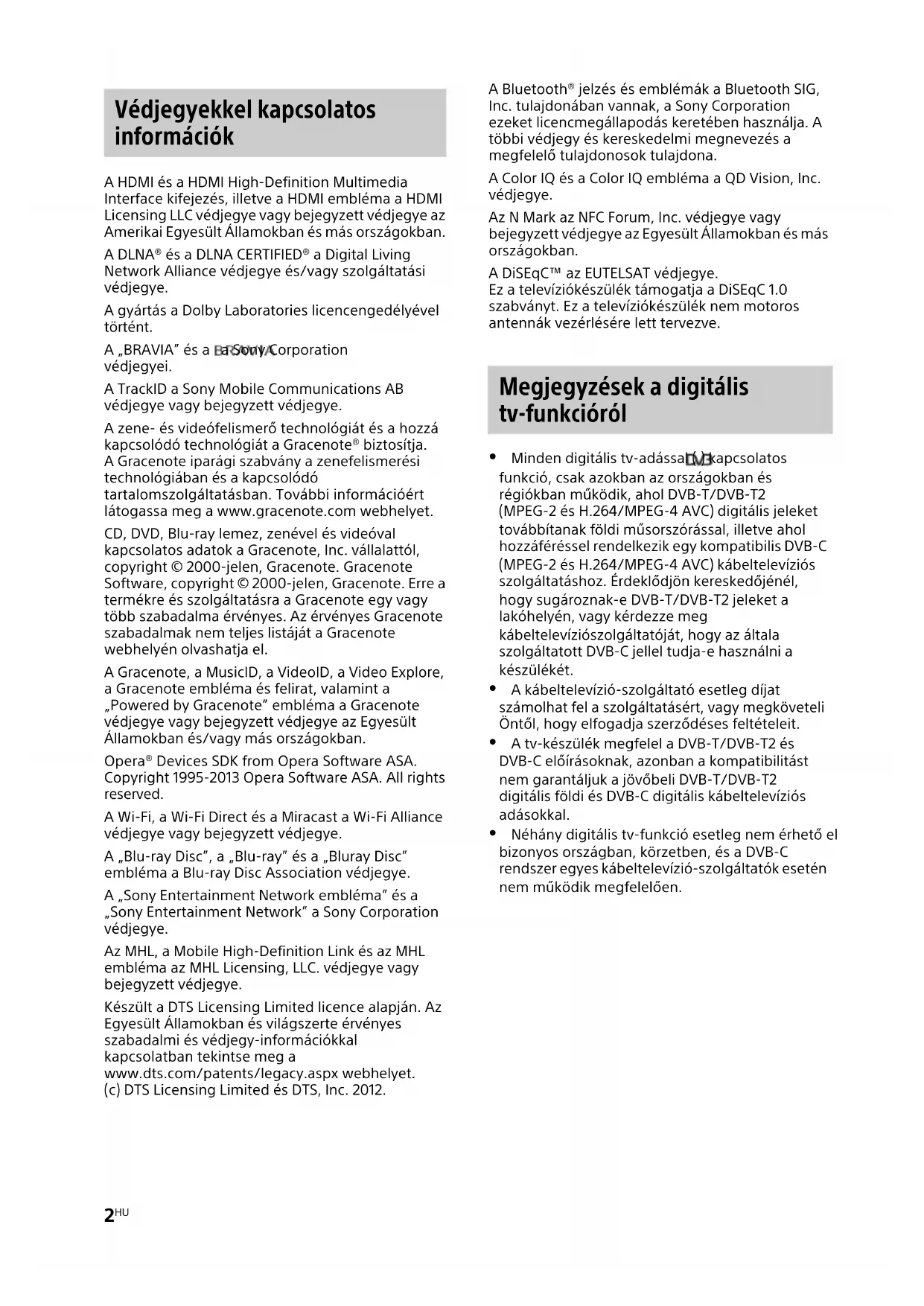 A HDMI és a HDMI High-Definition Multimedia Interface kifejezés, illetve a HDMI embléma a HDMI Licensing LLC védjegye vagy bejegyzett védjegye az Amerikai Egyesült Államokban és más országokban. A DLNA® és a DLNA CERTIFIED® a Digital Living Network Alliance védjegye és/vagy szolgáltatási védjegye. A gyártás a Dolby Laboratories licencengedélyével történt. A „BRAVIA” és a a Sony Corporation védjegyei. A TrackID a Sony Mobile Communications AB védjegye vagy bejegyzett védjegye. A zene- és videófelismerő technológiát és a hozzá kapcsolódó technológiát a Gracenote® biztosítja. A Gracenote iparági szabvány a zenefelismerési technológiában és a kapcsolódó tartalomszolgáltatásban. További információért látogassa meg a www.gracenote.com webhelyet. CD, DVD, Blu-ray lemez, zenével és videóval kapcsolatos adatok a Gracenote, Inc. vállalattól, copyright © 2000-jelen, Gracenote. Gracenote Software, copyright © 2000-jelen, Gracenote. Erre a termékre és szolgáltatásra a Gracenote egy vagy több szabadalma érvényes. Az érvényes Gracenote szabadalmak nem teljes listáját a Gracenote webhelyén olvashatja el. A Gracenote, a MusicID, a VideoID, a Video Explore, a Gracenote embléma és felirat, valamint a „Powered by Gracenote” embléma a Gracenote védjegye vagy bejegyzett védjegye az Egyesült Államokban és/vagy más országokban. Opera® Devices SDK from Opera Software ASA. Copyright 1995-2013 Opera Software ASA. All rights reserved. A Wi-Fi, a Wi-Fi Direct és a Miracast a Wi-Fi Alliance védjegye vagy bejegyzett védjegye. A „Blu-ray Disc”, a „Blu-ray” és a „Bluray Disc” embléma a Blu-ray Disc Association védjegye. A „Sony Entertainment Network embléma” és a „Sony Entertainment Network” a Sony Corporation védjegye. Az MHL, a Mobile High-Definition Link és az MHL embléma az MHL Licensing, LLC. védjegye vagy bejegyzett védjegye. Készült a DTS Licensing Limited licence alapján. Az Egyesült Államokban és világszerte érvényes szabadalmi és védjegy-információkkal kapcsolatban tekintse meg a www.dts.com/patents/legacy.aspx webhelyet. (c) DTS Licensing Limited és DTS, Inc. 2012. A Bluetooth® jelzés és emblémák a Bluetooth SIG, Inc. tulajdonában vannak, a Sony Corporation ezeket licencmegállapodás keretében használja. A többi védjegy és kereskedelmi megnevezés a megfelelő tulajdonosok tulajdona. A Color IQ és a Color IQ embléma a QD Vision, Inc. védjegye. Az N Mark az NFC Forum, Inc. védjegye vagy bejegyzett védjegye az Egyesült Államokban és más országokban. A DiSEqC™ az EUTELSAT védjegye. Ez a televíziókészülék támogatja a DiSEqC 1.0 szabványt. Ez a televíziókészülék nem motoros antennák vezérlésére lett tervezve. Minden digitális tv-adással ( ) kapcsolatos funkció, csak azokban az országokban és régiókban működik, ahol DVB-T/DVB-T2 (MPEG-2 és H.264/MPEG-4 AVC) digitális jeleket továbbítanak földi műsorszórással, illetve ahol hozzáféréssel rendelkezik egy kompatibilis DVB-C (MPEG-2 és H.264/MPEG-4 AVC) kábeltelevíziós szolgáltatáshoz. Érdeklődjön kereskedőjénél, hogy sugároznak-e DVB-T/DVB-T2 jeleket a lakóhelyén, vagy kérdezze meg kábeltelevíziószolgáltatóját, hogy az általa szolgáltatott DVB-C jellel tudja-e használni a készülékét. A kábeltelevízió-szolgáltató esetleg díjat számolhat fel a szolgáltatásért, vagy megköveteli Öntől, hogy elfogadja szerződéses feltételeit. A tv-készülék megfelel a DVB-T/DVB-T2 és DVB-C előírásoknak, azonban a kompatibilitást nem garantáljuk a jövőbeli DVB-T/DVB-T2 digitális földi és DVB-C digitális kábeltelevíziós adásokkal. Néhány digitális tv-funkció esetleg nem érhető el bizonyos országban, körzetben, és a DVB-C rendszer egyes kábeltelevízió-szolgáltatók esetén nem működik megfelelően. Védjegyekkel kapcsolatos információk Megjegyzések a digitális tv-funkcióról3