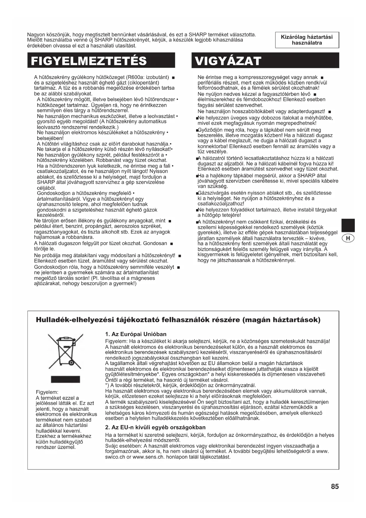 Zanim wezwiesz serwis, sprawdź poniższe punkty. Problem Rozwiązanie Zewnętrzna część obudowy jest gorąca w dotyku. To normalne. W obudowie znajduje się przewód grzejny, zapobiegający gromadzeniu się wilgoci. Lodówka hałasuje. Jest normalnym objawem, że lodówka wydaje następujące dźwięki. Głośny dźwięk wydawany przy rozpoczęciu pracy sprężarki • --- Dźwięk staje się po chwili cichszy. Głośny dźwięk wydawany raz dziennie przez sprężarkę • --- Dźwięk wskazujący na działanie wydawany natychmiast po automatycznym rozmrażaniu. Dźwięk przelewanego płynu (bulgotanie, syczenie) • --- Dźwięk czynnika chłodzącego w przewodach chłodzących (od czasu do czasu dźwięk może być głośniejszy). Dźwięk pękania lub trzaskania, dźwięk skrzypienia • --- Dźwięk powstający podczas rozszerzania lub kurczenia się wewnętrznych ścian i części lodówki podczas ochładzania. Wewnątrz lub na zewnątrz lodówki pojawia się szron lub zbiera się wilgoć. Może do tego dochodzić w jednym z poniższych przypadków. Użyj mokrej ściereczki do starcia szronu i suchej ściereczki do starcia wilgoci. Jeśli wilgotność otoczenia jest wysoka.• Jeśli drzwi lodówki są często otwierane i zamykane.• Jeśli przechowywana jest żywność zawierająca dużo wilgoci. (Należy ją w coś zawinąć.)• Żywność w komorze lodówki zamarza. Czy lodówka jest używana przez dłuższy czas z temperaturą chłodzenia ustawioną na • 0°C? Czy lodówka jest używana przez dłuższy czas z temperaturą zamrażania ustawioną na • -21°C? Niska temperatura otoczenia może także spowodować zamarznięcie produktów • żywnościowych w lodówce, nawet jeśli temperaturą chłodzenia nastawiona jest w pozycji 6°C. Nieprzyjemny zapach w komorze lodówki. Żywność o silnym zapachu należy owinąć lub zapakować.• Urządzenie dezodoryzujące nie jest w stanie całkowicie usunąć zapachu.• Dotykowy panel sterowania nie działa. Taka sytuacja może wystąpić w jednym z następujących przypadków. Panel lub palec jest zabrudzony tłuszczem, olejem itp.• Dotknij panel ręką w rękawiczce, plastrem na palcu lub paznokciu bądź przedmiocie.• Na przyciskach jest przyklejona naklejka lub taśma.• Przyciski są niedokładnie naciskane.• Zbyt krótki czas przytrzymania przycisków, aby one zadziałały.• JEŚLI NADAL POTRZEBUJESZ PORADY W SERWISIE Skonsultuj się z najbliższym punktem serwisowym autoryzowanym przez rmę SHARP. (B245)-E.indb 84 2011/09/01 10:15:3285 Kizárólag háztartási használatra Nagyon köszönjük, hogy megtisztelt bennünket vásárlásával, és ezt a SHARP terméket választotta. Mielőtt használatba venné új SHARP hűtőszekrényét, kérjük, a készülék legjobb kihasználása érdekében olvassa el ezt a használati utasítást. A hűtőszekrény gyúlékony hűtőközeget (R600a: izobutánt) ■ és a szigeteléshez használt éghető gázt (ciklopentánt) tartalmaz. A tűz és a robbanás megelőzése érdekében tartsa be az alábbi szabályokat. A hűtőszekrény mögött, illetve belsejében lévő hűtőrendszer • hűtőközeget tartalmaz. Ügyeljen rá, hogy ne érintkezzen semmilyen éles tárgy a hűtőrendszerrel. Ne használjon mechanikus eszközöket, illetve a leolvasztást • gyorsító egyéb megoldást! (A hűtőszekrény automatikus leolvasztó rendszerrel rendelkezik.) Ne használjon elektromos készülékeket a hűtőszekrény • belsejében! A hűtőtéri világításhoz csak az előírt darabokat használja.• Ne takarja el a hűtőszekrény külső részén lévő nyílásokat!• Ne használjon gyúlékony szprét, például festékszórót a • hűtőszekrény közelében. Robbanást vagy tüzet okozhat. Ha a hűtőrendszeren lyuk keletkezik, ne érintse meg a fali • csatlakozóaljzatot, és ne használjon nyílt lángot! Nyisson ablakot, és szellőztesse ki a helyiséget, majd forduljon a SHARP által jóváhagyott szervizhez a gép szervizelése céljából. Gondoskodjon a hűtőszekrény megfelelő • ártalmatlanításáról. Vigye a hűtőszekrényt egy újrahasznosító telepre, ahol megfelelően tudnak gondoskodni a szigeteléshez használt éghető gázok kezeléséről. Ne tároljon erősen illékony és gyúlékony anyagokat, mint ■ például étert, benzint, propángázt, aeroszolos szpréket, ragasztóanyagokat, és tiszta alkoholt stb. Ezek az anyagok hajlamosak a robbanásra. A hálózati dugaszon felgyűlt por tüzet okozhat. Gondosan ■ törölje le. Ne próbálja meg átalakítani vagy módosítani a hűtőszekrényt! ■ Ellenkező esetben tüzet, áramütést vagy sérülést okozhat. Gondoskodjon róla, hogy a hűtőszekrény semmiféle veszélyt ■ ne jelentsen a gyermekek számára az ártalmatlanítást megelőző tárolás során! (Pl. távolítsa el a mágneses ajtózárakat, nehogy beszoruljon a gyermek!) FIGYELMEZTETÉS VIGYÁZAT Ne érintse meg a kompresszoregységet vagy annak ■ perifériális részeit, mert ezek működés közben rendkívül felforrósodhatnak, és a fémélek sérülést okozhatnak! Ne nyúljon nedves kézzel a fagyasztótérben lévő ■ élelmiszerekhez és fémdobozokhoz! Ellenkező esetben fagyási sérülést szenvedhet. Ne használjon hosszabbítókábelt vagy adapterdugaszt! ■ Ne helyezzen üveges vagy dobozos italokat a mélyhűtőbe, ■ mivel ezek megfagyásuk nyomán megrepedhetnek! Győződjön meg róla, hogy a tápkábel nem sérült meg ■ beszerelés, illetve mozgatás közben! Ha a hálózati dugasz vagy a kábel meglazult, ne dugja a hálózati dugaszt a konnektorba! Ellenkező esetben fennáll az áramütés vagy a tűz veszélye. A hálózatról történő lecsatlakoztatáshoz húzza ki a hálózati ■ dugaszt az aljzatból. Ne a hálózati kábelnél fogva húzza ki! Ellenkező esetben áramütést szenvedhet vagy tüzet okozhat. Ha a hajlékony tápkábel megsérül, akkor a SHARP által 