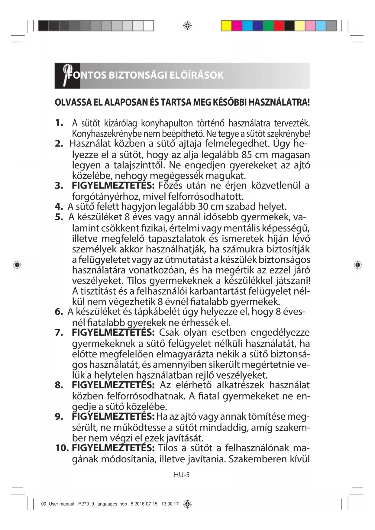 megbizonyosodhat arról, hogy a sütő a kívánt módon működik-e. 00_User manual - R270_9_languages.indb 8 2016-07-15 13:00:17HU-9