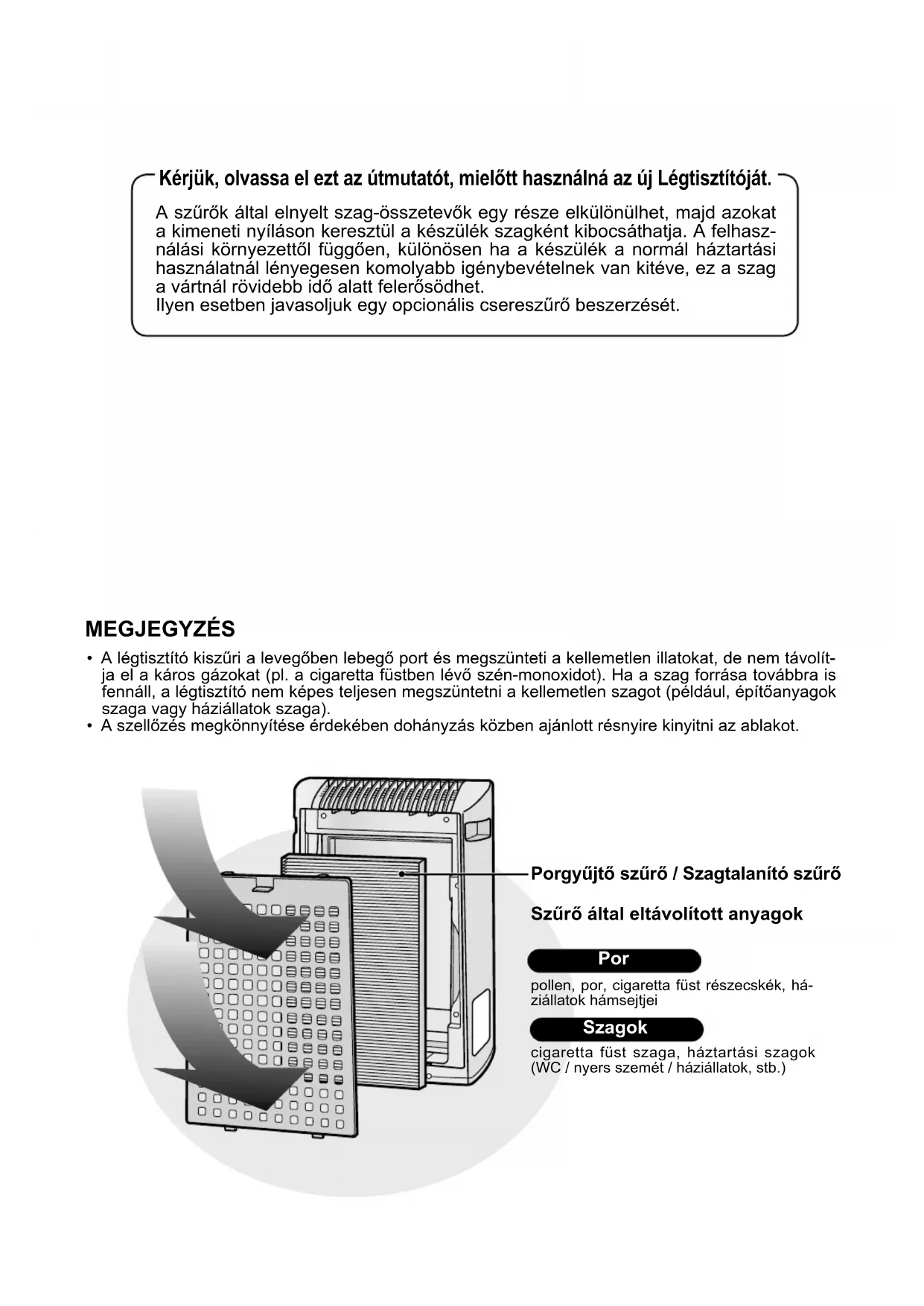 - A szellőzés megkönnyítése érdekében dohányzás közben ajánlott résnyire kinyitni az ablakot. Porgyűjtő szűrő / Szagtalanító szűrő Por Szagok pollen, por, cigaretta füst részecskék, há- ziállatok hámsejtjei cigaretta füst szaga, háztartási szagok (WC / nyers szemét / háziállatok, stb.) Szűrő által eltávolított anyagok KC-930EUOMHU.indd1KC-930EUOMHU.indd1 2009/09/1111:21:062009/09/1111:21:06MAGYAR HU-1 MAGYAR Köszönjük, hogy megvásárolta ezt a SHARP légtisztítót! Kérjük, a helyes használat meg- ismerése érdekében olvassa el figyelmesen ezt az útmutatót. A készülék használata előtt olvassa el a következő részt: “Fontos bizton- sági előírások.” A használati útmutatót elolvasása után tartsa könnyen elérhető helyen az esetleges későb- bi használat érdekében!