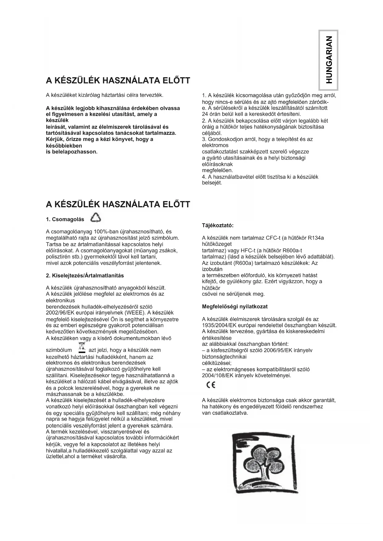 Tájékoztató: A készülék nem tartalmaz CFC-t (a hűtőkör R134a hűtőközeget tartalmaz) vagy HFC-t (a hűtőkör R600a-t tartalmaz) (lásd a készülék belsejében lévő adattáblát). Az izobutánt (R600a) tartalmazó készülékek: Az izobután a természetben előforduló, kis környezeti hatást kifejtő, de gyúlékony gáz. Ezért vigyázzon, hogy a hűtőkör csövei ne sérüljenek meg. Megfelelőségi nyilatkozat A készülék élelmiszerek tárolására szolgál és az 1935/2004/EK európai rendelettel összhangban készült. A készülék tervezése, gyártása és kiskereskedelmi értékesítése az alábbiakkal összhangban történt: – a kisfeszültségről szóló 2006/95/EK irányelv biztonságtechnikai célkitűzései; – az elektromágneses kompatibilitásról szóló 2004/108/EK irányelv követelményei.
