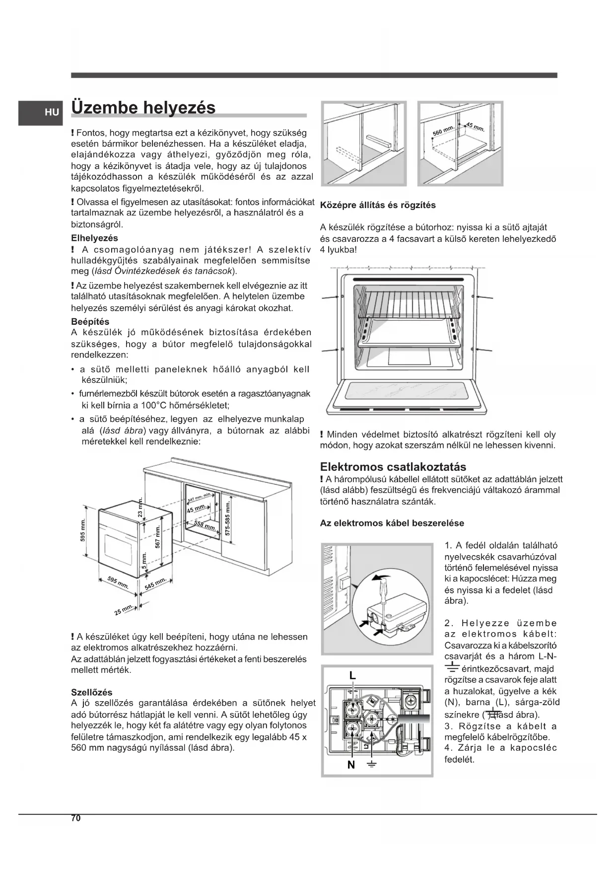 - a sütő beépítéséhez, legyen az elhelyezve munkalap alá (lásd ábra) vagy állványra, a bútornak az alábbi méretekkel kell rendelkeznie: 595 mm. 595 mm. 25 mm.545 mm.5 mm.567 mm.23 mm.575-585 mm.45 mm.558 mm.547 mm. min. ! A készüléket úgy kell beépíteni, hogy utána ne lehessen az elektromos alkatrészekhez hozzáérni. Az adattáblán jelzett fogyasztási értékeket a fenti beszerelés mellett mérték. Szellőzés A jó szellőzés garantálása érdekében a sütőnek helyet adó bútorrész hátlapját le kell venni. A sütőt lehetőleg úgy helyezzék le, hogy két fa alátétre vagy egy olyan folytonos felületre támaszkodjon, ami rendelkezik egy legalább 45 x 560 mm nagyságú nyílással (lásd ábra). 560 mm. 45 mm. Középre állítás és rögzítés A készülék rögzítése a bútorhoz: nyissa ki a sütő ajtaját és csavarozza a 4 facsavart a külső kereten lehelyezkedő 4 lyukba! ! Minden védelmet biztosító alkatrészt rögzíteni kell oly módon, hogy azokat szerszám nélkül ne lehessen kivenni. Elektromos csatlakoztatás ! A hárompólusú kábellel ellátott sütőket az adattáblán jelzett (lásd alább) feszültségű és frekvenciájú váltakozó árammal történő használatra szánták. Az elektromos kábel beszerelése