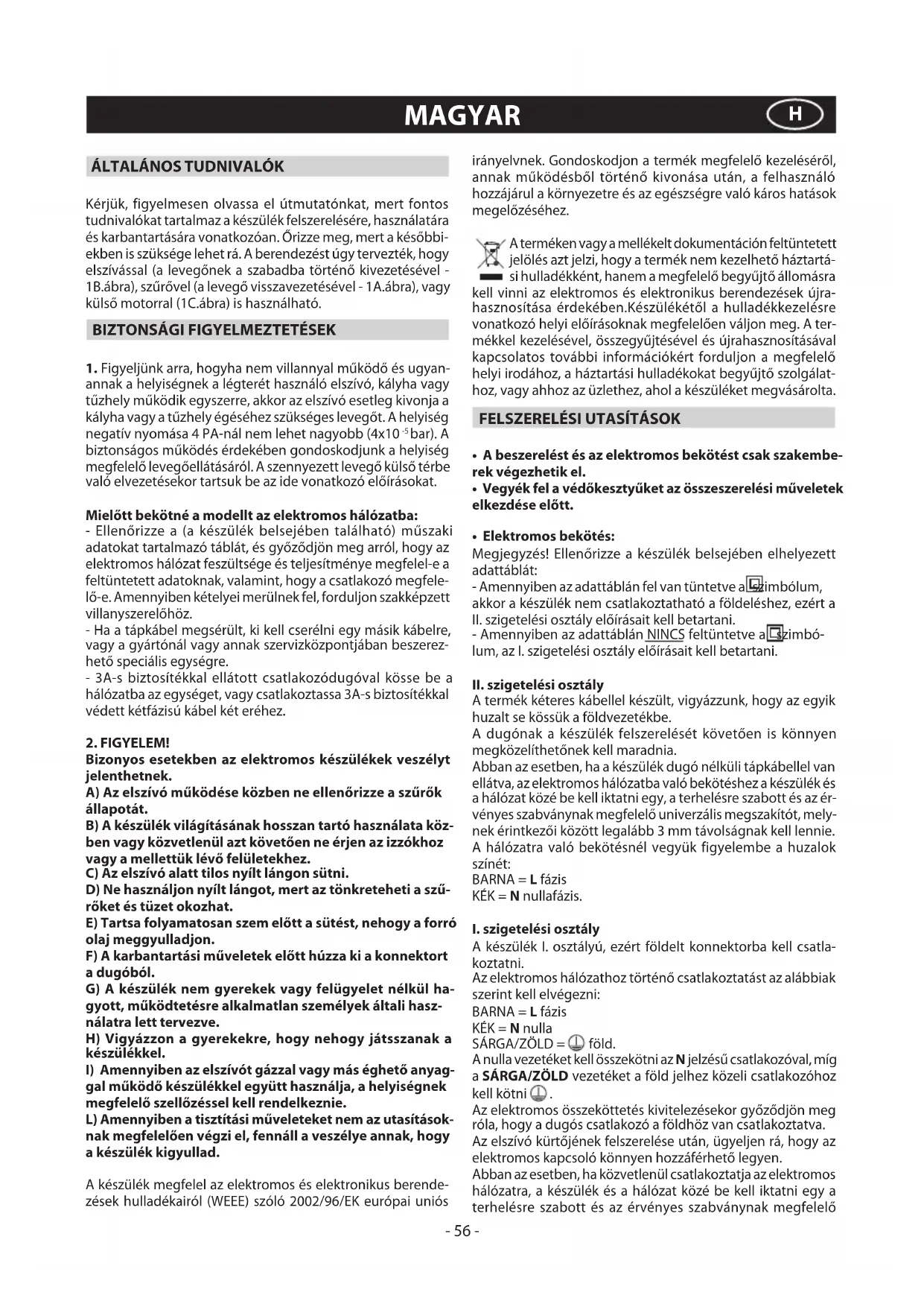 bar). A biztonságos működés érdekében gondoskodjunk a helyiség megfelelő levegőellátásáról. A szennyezett levegő külső térbe való elvezetésekor tartsuk be az ide vonatkozó előírásokat. Mielőttbekötnéamodelltazelektromoshálózatba: - Ellenőrizze a (a készülék belsejében található) műszaki adatokat tartalmazó táblát, és győződjön meg arról, hogy az elektromos hálózat feszültsége és teljesítménye megfelel-e a feltüntetett adatoknak, valamint, hogy a csatlakozó megfele- lő-e. Amennyiben kételyei merülnek fel, forduljon szakképzett villanyszerelőhöz. - Ha a tápkábel megsérült, ki kell cserélni egy másik kábelre, vagy a gyártónál vagy annak szervizközpontjában beszerez- hető speciális egységre. - 3A-s biztosítékkal ellátott csatlakozódugóval kösse be a hálózatba az egységet, vagy csatlakoztassa 3A-s biztosítékkal védett kétfázisú kábel két eréhez.