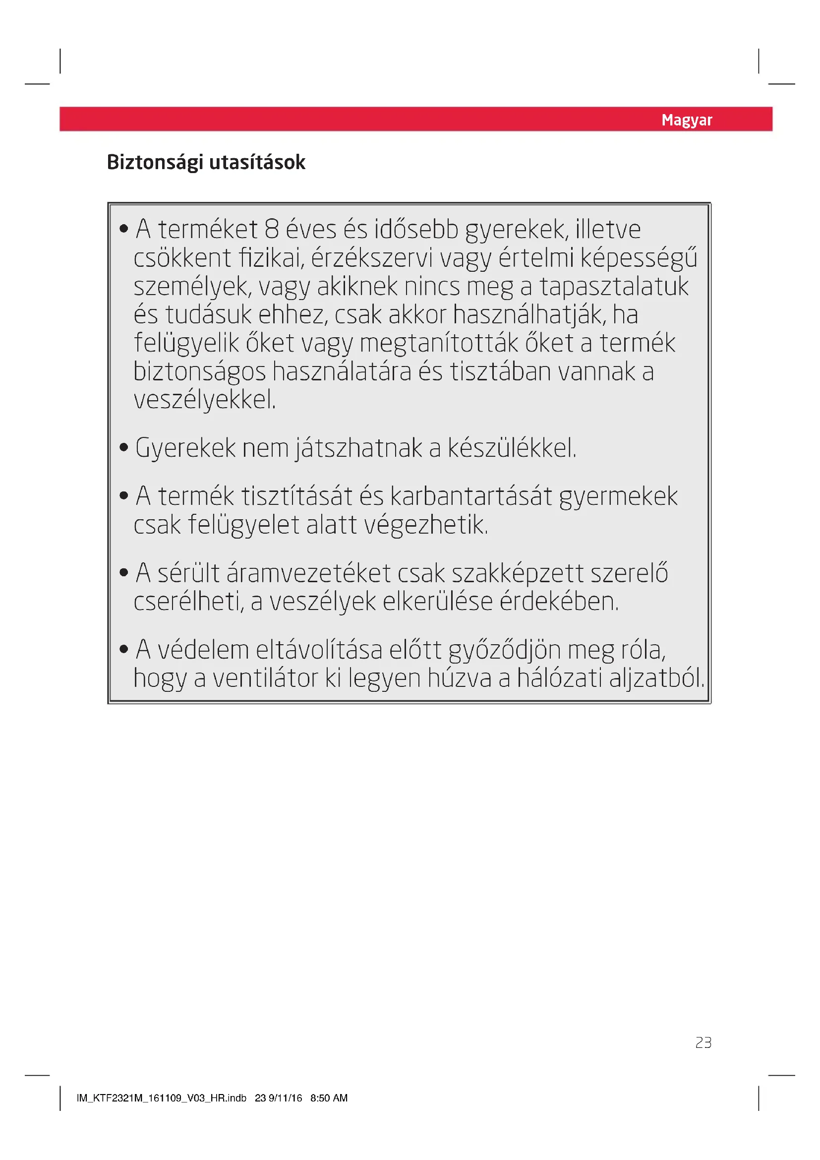 - A védelem eltávolítása előtt győződjön meg róla, hogy a ventilátor ki legyen húzva a hálózati aljzatból. IM_KTF2321M_161109_V03_HR.indb 23 9/11/16 8:50 AMMagyar
