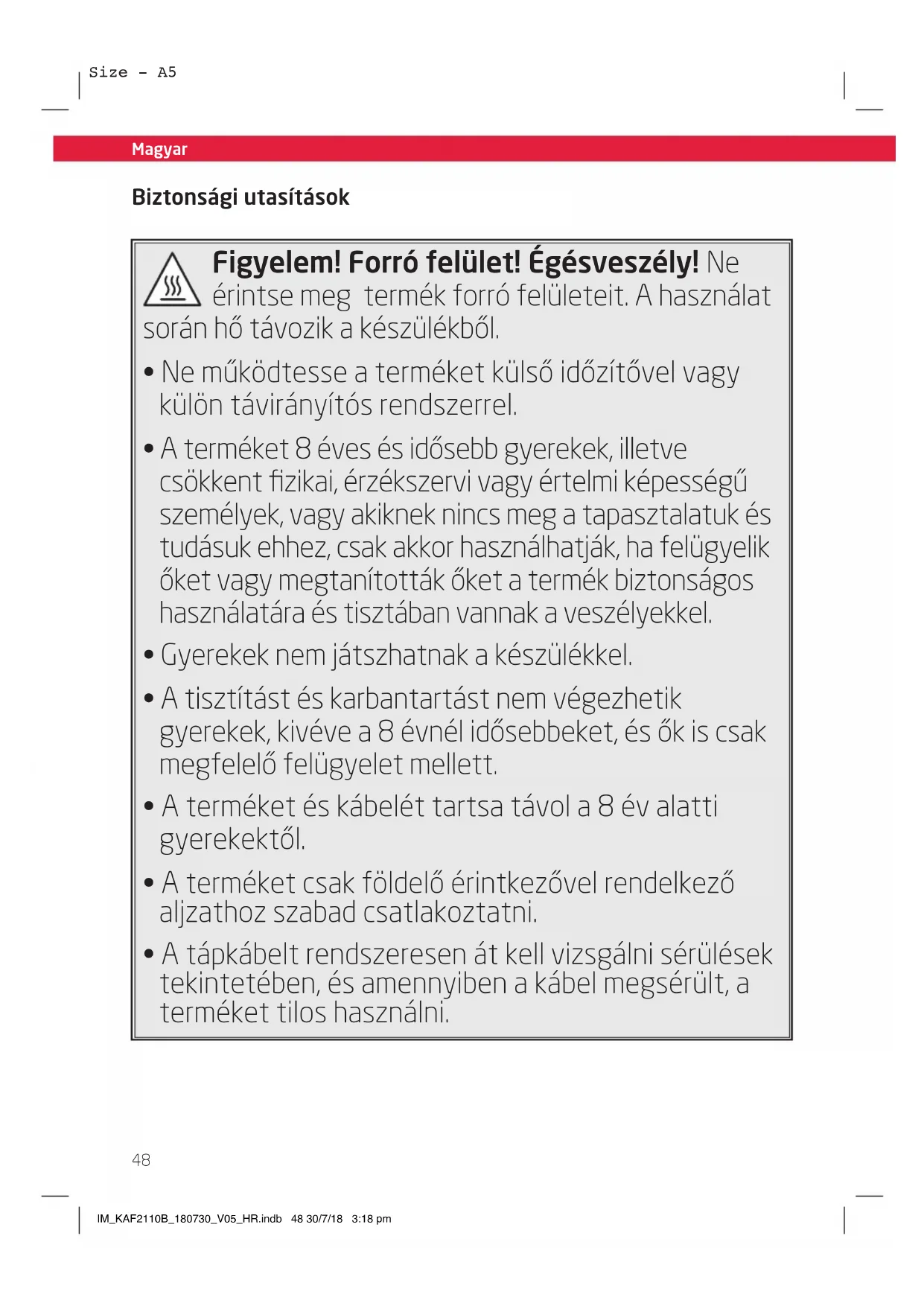 - A tápkábelt rendszeresen át kell vizsgálni sérülések tekintetében, és amennyiben a kábel megsérült, a terméket tilos használni. IM_KAF2110B_180730_V05_HR.indb 48 30/7/18 3:18 pmMagyar
