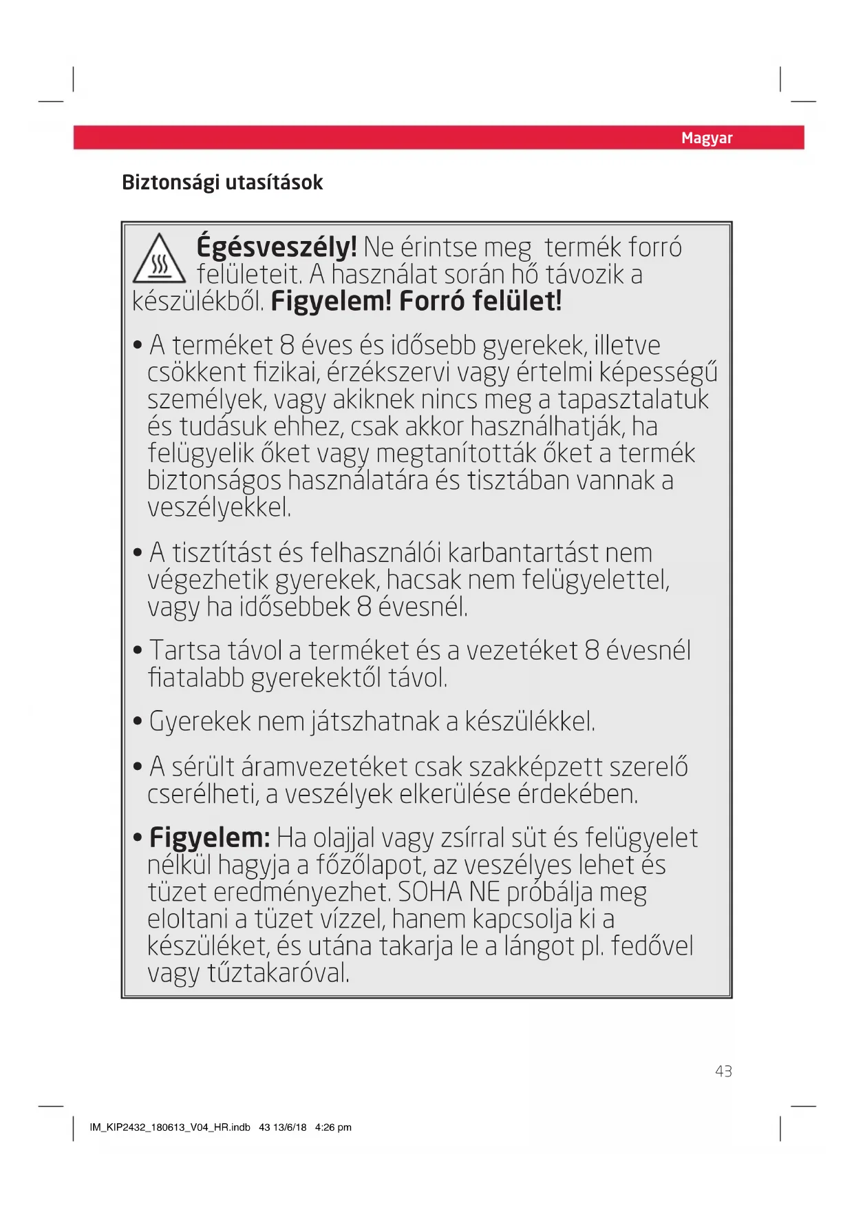 - Figyelem: Ha olajjal vagy zsírral süt és felügyelet nélkül hagyja a főzőlapot, az veszélyes lehet és tüzet eredményezhet. SOHA NE próbálja meg eloltani a tüzet vízzel, hanem kapcsolja ki a készüléket, és utána takarja le a lángot pl. fedővel vagy tűztakaróval. IM_KIP2432_180613_V04_HR.indb 43 13/6/18 4:26 pmMagyar