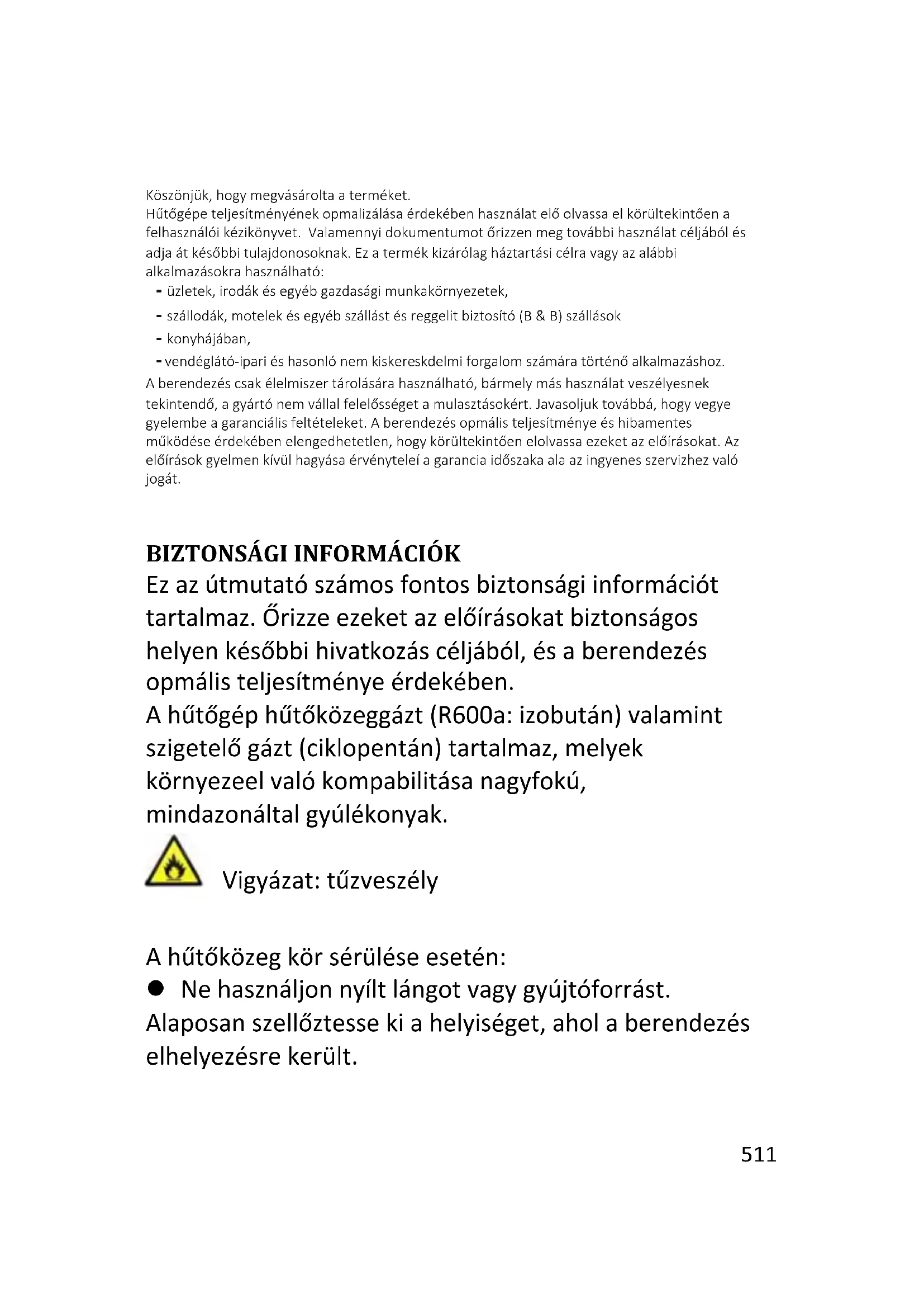 Ez az útmutató számos fontos biztonsági információt tartalmaz. Őrizze ezeket az előírásokat biztonságos helyen későbbi hivatkozás céljából, és a berendezés optimális teljesítménye érdekében. A hűtőgép hűtőközeggázt (R600a: izobután) valamint szigetelő gázt (ciklopentán) tartalmaz, melyek környezettel való kompatibilitása nagyfokú, mindazonáltal gyúlékonyak. Vigyázat: tűzveszély A hűtőközeg kör sérülése esetén: Ne használjon nyílt lángot vagy gyújtóforrást. Alaposan szellőztesse ki a helyiséget, ahol a berendezés elhelyezésre került. Átlagos üzemidő:512 FIGYELMEZTETÉS! A berendezés hátsó részén a kondenzátor fém vezetékeinek érintése elkerülése érdekében a berendezés tisztítását/szállítását körültekintően kell végezni, mivel megsérülhet az ujja, keze, vagy a termék. A berendezés tervezése nem más berendezésekre történő elhelyezésre történt. Ne próbáljon a berendezésre ráülni vagy ráállni, mert tervezése nem erre a célra történt. Az Ön vagy a termék sérülését okozhatja. A főkábelek törése és sérülése érdekében ellenőrizze, hogy a főkábelek nem szorultak-e a berendezés alá a szállítás/mozgatás alatt és után. A berendezés elhelyezésekor ügyeljen arra, hogyne sérüljön meg a padló, ne sérüljenek meg a csövek, falburkolatok, stb. Ne mozgassa a berendezést a fedél vagy a fogantyú húzásával. Ne engedje gyerekeknek, hogy játsszanak a berendezéssel és a vezérlőkkel. Társaságunk elhárít minden felelősséget az előírások be nem tartása esetén. Ne telepítse a berendezést nedves, olajos vagy poros helyre, ne tegye ki közvetlen napfénynek és víznek. Ne telepítse a berendezést fűtő egységek vagy gyúlékony anyagok közelébe.513 Hálózati hiba esetén ne nyissa fel a fedelet. A fagyasztott élelmiszert nem befolyásolja ha a hiba maximum 20 órán át áll fenn. Ha a hiba ennél tovább tart, ellenőrizni kell az élelmiszert, azonnal el kell fogyasztani, vagy meg kell főzni, majd újból le kell fagyasztani. Ha azt észleli, hogy a fagyasztóláda fedele nehezen nyílik lezárást követően, ne aggódjon. Ez a nyomáskülönbség miatt van, mely kiegyenlítődik és néhány másodperc eltelte után lehetővé teszi a fedél felnyitását. Ne csatlakoztassa a berendezést az elektromos hálózathoz, míg a csomagoláshoz és szállításhoz használt valamennyi védelmet el nem távolított. Vízszintes szállítás után hagyja 4 órát pihenni bekapcsolás előtt, hogy a kompreszor olaj leüllepedjen. A fagyasztó csak az előírt célra használható (fagyasztható élelmiszer). Ne tároljon orvosságot vagy kutatáshoz használt anyagokat a borhűtőben. Ha olyan anyagot tárol, melynek tárolási hőmérsékletét szigorúan ellenőrizni kell, előfordulhat, hogy az anyag megromlik, vagy ellenőrizhetetlen reakció lép fel, mely kockázatokat okozhat. Bármilyen művelet előtt válassza le a berendezést az elektromos hálózatról. Kézbesítéskor ellenőrizze, hogy a termék nem sérült és valamennyi alkatrésze és tartozéka megfelelő állapotban van.514 Ha a fagyasztó rendszer szivárgását észleli, ne érintse a fali csatlakozót és ne használjon nyílt lángot. Nyissa ki az ablakot és szellőztesse ki a helyiséget. Hívjon szakembert a hiba elhárításához. Ne használjon hosszabbító kábeleket vagy adaptereket. Ne húzza meg túlságosan a tápkábelt, ne érintse a csatlakozót nedves kézzel. Ne sértse meg a csatlakozót és/vagy a tápkábelt; áramütést vagy tüzet okozhat. Ne helyezzen vagy tároljon gyúlékony vagy nagyon illékony anyagokat, például étert, benzint, LPG-t, propán gázt, spray dobozokat, ragasztókat, tiszta alkoholt, stb. Ha a tápkábel sérült – a kockázatok minimalizálása érdekében –, a gyártónak, a gyártó szervizpartnerének vagy hasonló, képzett személynek kell kicserélnie. Ne használjon vagy tároljon gyúlékony sprayt, például festékszórót a borhűtő mellett. Robbanást vagy tüzet okozhat. Ne helyezzen tárgyakat és/vagy vízzel töltött tartályokat a berendezésre. Nem javasoljuk hosszabbító vezetékek és több- utas adapterek használatát.515 Ne helyezze a berendezést tűzbe Ügyeljen arra, hogy szállítás és használat során ne sérüljön meg a berendezés hűtőköre/csövei. Sérülés esetén ne tegye ki a berendezést tűznek, potenciális gyújtóforrásnak, azonnal szellőztesse ki a helyiséget, ahol a berendezést elhelyezte. A borhűtő mögött és a borhűtőben lévő hűtőrendszer hűtőközeggázt tartalmaz. Éppen ezért ne sértse meg a csöveket. Ne használjon elektromos berendezéseket a berendezés élelmiszer tároló rekeszében, kivéve a gyártó által jóváhagyott típust. Ne okozza a hűtőközeg kör sérülését. A kiolvasztási folyamat felgyorsításához csak a gyártó által javasolt mechanikai berendezéseket vagy egyéb eszközöket használja. Ne használjon elektromos berendezéseket az élelmiszer tároló rekeszben, kivéve a gyártó által jóváhagyott típust. A berendezés tokozásában vagy a beépített szerkezetben a ventilációs nyílásokat hagyja akadálymentesen. Ne használjon hegyes vagy éles tárgyakat, kést vagy villát a jég eltávolításához. Ne érintse meg a belső hűtőelemeket, különösen nedves kézzel ne – ilyen esetben égési vagy más sérüléseket szenvedhet. Ne használjon hajszárítót, elektromos fűtő egységeket vagy egyéb hasonló elektromos berendezést a kiolvasztáshoz.516 Ne kaparja késsel vagy éles tárggyal a jeget. Megsérülhet a hűtőközeg kör, a szivárgás tüzet vagy szemsérülést okozhat. Ne használjon mechanikai eszközöket vagy egyéb berendezést a kiolvasztási folyamat felgyorsításához. Szigorúan tilos nyílt láng vagy elektromos berendezések például fűtő egységek, gőztisztító