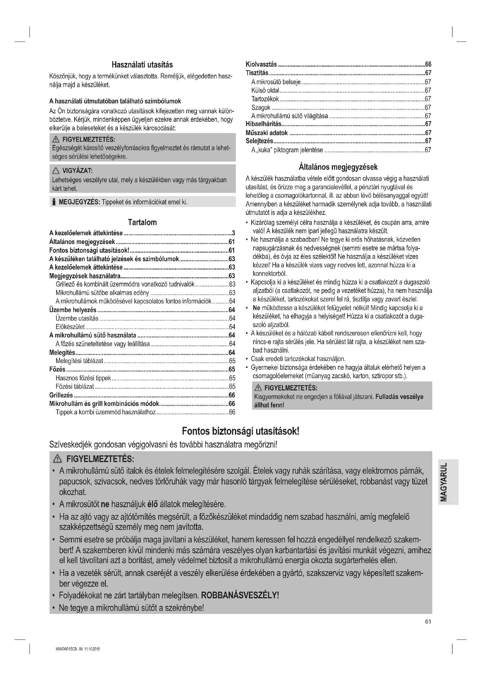 - A mikrohullámú sütő használata p. 64