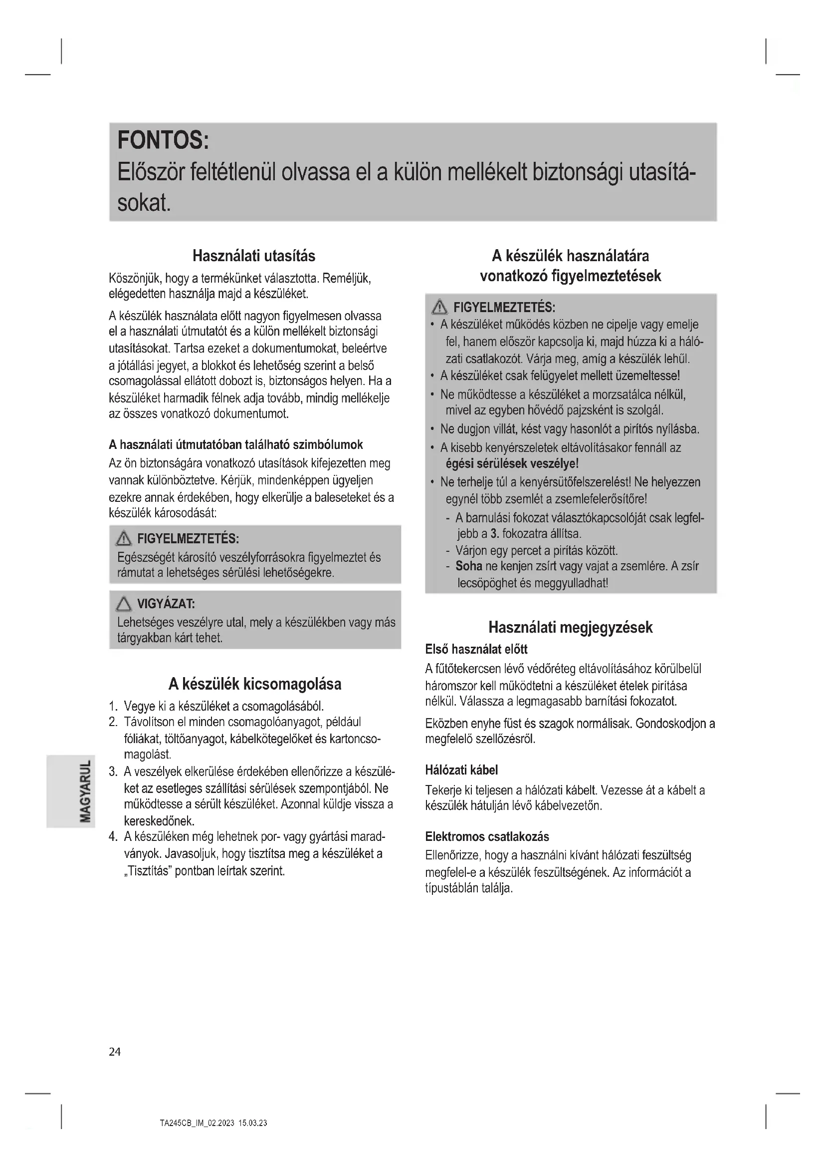 - Ne terhelje túl a kenyérsütőfelszerelést! Ne helyezzen egynél több zsemlét a zsemlefelerősítőre! - A barnulási fokozat választókapcsolóját csak legfel- jebb a 3. fokozatra állítsa. - Várjon egy percet a pirítás között. - Soha ne kenjen zsírt vagy vajat a zsemlére. A zsír lecsöpöghet és meggyulladhat! Használati megjegyzések Első használat előtt A fűtőtekercsen lévő védőréteg eltávolításához körülbelül háromszor kell működtetni a készüléket ételek pirítása nélkül. Válassza a legmagasabb barnítási fokozatot. Eközben enyhe füst és szagok normálisak. Gondoskodjon a megfelelő szellőzésről. Hálózati kábel Tekerje ki teljesen a hálózati kábelt. Vezesse át a kábelt a készülék hátulján lévő kábelvezetőn. Elektromos csatlakozás Ellenőrizze, hogy a használni kívánt hálózati feszültség megfelel-e a készülék feszültségének. Az információt a típustáblán találja.TA245CB_IM_02.2023 15.03.23