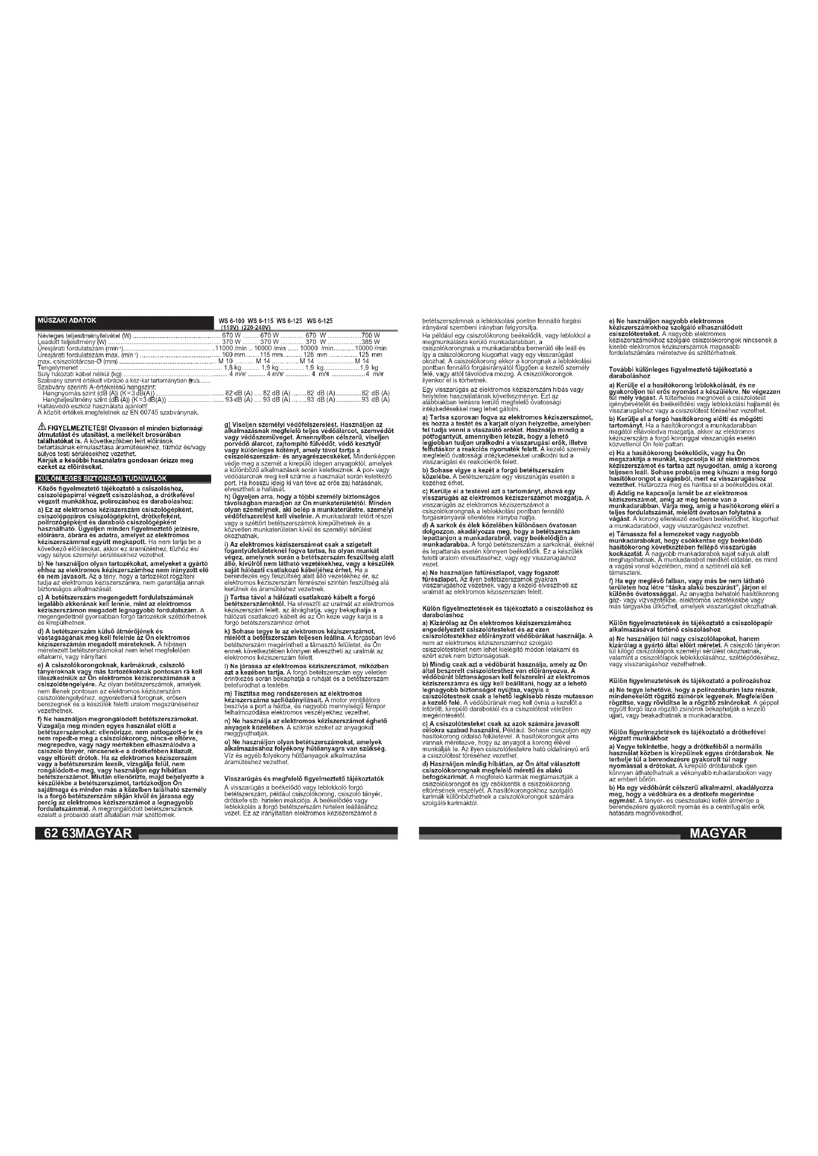 Szabvány szerinti A-értékelésű hangszint: Hangnyomás szint (dB (A)) (K = 3 dB(A)) ............................... Hangteljesítmény szint (dB (A)) (K = 3 dB(A)) ........................ Hallásvédő eszköz használata ajánlott! A közölt értékek megfelelnek az EN 60745 szabványnak. FIGYELMEZTETÉS! Olvasson el minden biztonsági útmutatást és utasítást, a mellékelt brosúrában találhatókat is. A következőkben leírt előírások betartásának elmulasztása áramütésekhez, tűzhöz és/vagy súlyos testi sérülésekhez vezethet. Kérjük a későbbi használatra gondosan őrizze meg ezeket az előírásokat. KÜLÖNLEGES BIZTONSÁGI TUDNIVALÓK Közös gyelmeztető tájékoztató a csiszoláshoz, csiszolópapírral végzett csiszoláshoz, a drótkefével végzett munkákhoz, polírozáshoz és daraboláshoz: a) Ez az elektromos kéziszerszám csiszológépként, csiszolópapíros csiszológépként, drótkefeként, polírozógépként és daraboló csiszológépként használható. Ügyeljen minden gyelmeztető jelzésre, előírásra, ábrára és adatra, amelyet az elektromos kéziszerszámmal együtt megkapott. Ha nem tartja be a következő előírásokat, akkor ez áramütéshez, tűzhöz és/ vagy súlyos személyi sérülésekhez vezethet. b) Ne használjon olyan tartozékokat, amelyeket a gyártó ehhez az elektromos kéziszerszámhoz nem irányzott elő és nem javasolt. Az a tény, hogy a tartozékot rögzíteni tudja az elektromos kéziszerszámra, nem garantálja annak biztonságos alkalmazását. c) A betétszerszám megengedett fordulatszámának legalább akkorának kell lennie, mint az elektromos kéziszerszámon megadott legnagyobb fordulatszám. A megengedettnél gyorsabban forgó tartozékok széttörhetnek és kirepülhetnek. d) A betétszerszám külső átmérőjének és vastagságának meg kell felelnie az Ön elektromos kéziszerszámán megadott méreteknek. A hibásan méretezett betétszerszámokat nem lehet megfelelően eltakarni, vagy irányítani. e) A csiszolókorongoknak, karimáknak, csiszoló tányéroknak vagy más tartozékoknak pontosan rá kell illeszkedniük az Ön elektromos kéziszerszámának a csiszolótengelyére. Az olyan betétszerszámok, amelyek nem illenek pontosan az elektromos kéziszerszám csiszolótengelyéhez, egyenletlenül forognak, erősen berezegnek és a készülék feletti uralom megszűnéséhez vezethetnek. f) Ne használjon megrongálódott betétszerszámokat. Vizsgálja meg minden egyes használat előtt a betétszerszámokat: ellenőrizze, nem pattogzott-e le és nem repedt-e meg a csiszolókorong, nincs-e eltörve, megrepedve, vagy nagy mértékben elhasználódva a csiszoló tányér, nincsenek-e a drótkefében kilazult, vagy eltörött drótok. Ha az elektromos kéziszerszám vagy a betétszerszám leesik, vizsgálja felül, nem rongálódott-e meg, vagy használjon egy hibátlan betétszerszámot. Miután ellenőrizte, majd behelyezte a készülékbe a betétszerszámot, tartózkodjon Ön sajátmaga és minden más a közelben található személy is a forgó betétszerszám síkján kívül és járassa egy percig az elektromos kéziszerszámot a legnagyobb fordulatszámmal. A megrongálódott betétszerszámok ezalatt a próbaidő alatt általában már széttörnek. g) Viseljen személyi védőfelszerelést. Használjon az alkalmazásnak megfelelő teljes védőálarcot, szemvédőt vagy védőszemüveget. Amennyiben célszerű, viseljen porvédő álarcot, zajtompító fülvédőt, védő kesztyűt vagy különleges kötényt, amely távol tartja a csiszolószerszám- és anyagrészecskéket. Mindenképpen védje meg a szemét a kirepülő idegen anyagoktól, amelyek a különböző alkalmazások során keletkeznek. A por- vagy védőálarcnak meg kell szűrnie a használat során keletkező port. Ha hosszú ideig ki van téve az erős zaj hatásának, elvesztheti a hallását. h) Ügyeljen arra, hogy a többi személy biztonságos távolságban maradjon az Ön munkaterületétől. Minden olyan személynek, aki belép a munkaterületre, személyi védőfelszerelést kell viselnie. A munkadarab letört részei vagy a széttört betétszerszámok kirepülhetnek és a közvetlen munkaterületen kívül és személyi sérülést okozhatnak.