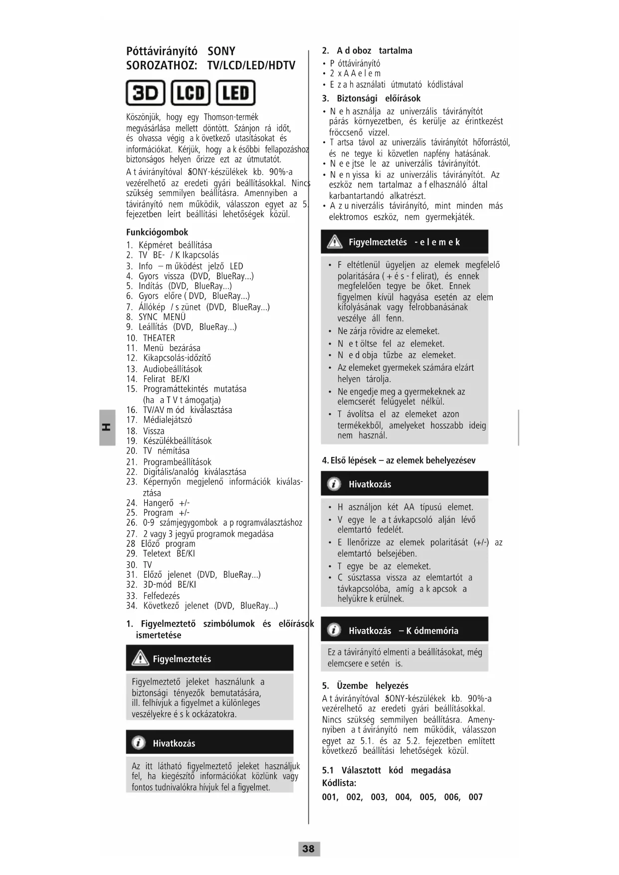 Köszönjük, hogy egy Thomson-termék megvásárlása mellett döntött. Szánjon rá időt, és olvassa végig akövetkező utasításokat és információkat. Kérjük, hogy akésőbbi fellapozáshoz biztonságos helyen őrizze ezt az útmutatót. Atávirányítóval a SONY -készülékek kb. 90%-a vezérelhető az eredeti gyári beállításokkal. Nincs szükség semmilyen beállításra. Amennyiben a távirányító nem működik, válasszon egyet az 5. fejezetben leírt beállítási lehetőségek közül. Funkciógombok
