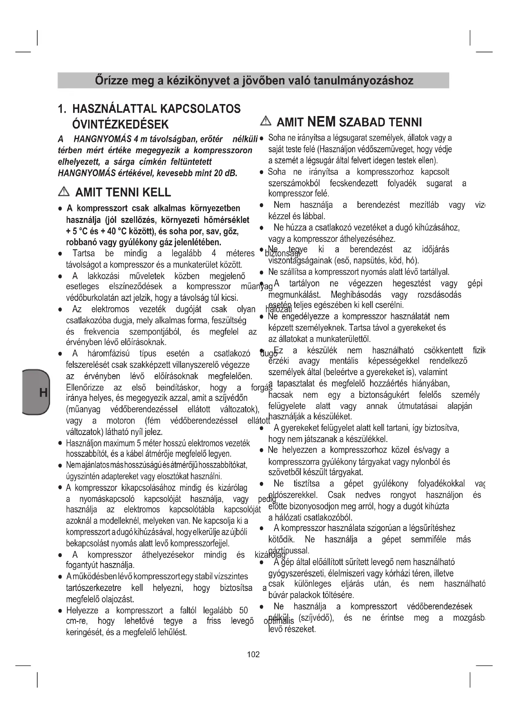 A kompresszor száraz termekbeni használatra al- kalmas.Tiltottahasználataazolyankörnyezetben, aholfröccsenôvízzeldolgoznak.