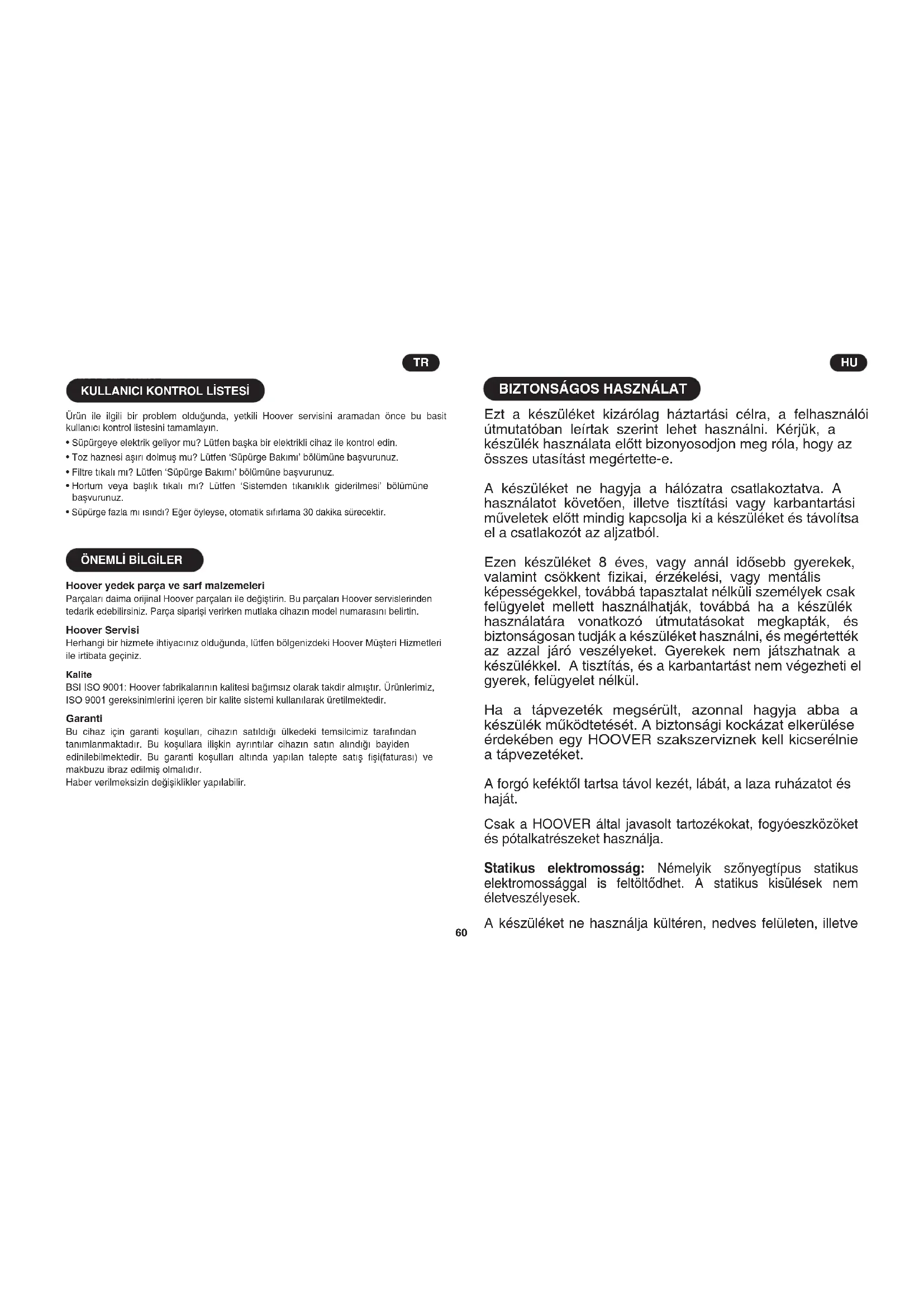 Hooveralkatrészekésfogyóeszközök Az alkatrészeket minden esetben eredeti Hoover pótalkatrészekkel cserélje ki. Ezeket a helyi Hoover kereskedőtől vagy közvetlenül a Hoover-től vásárolhatja meg. Az alkatrészek rendelésekor mindig adja meg a készülék modellszámát. Hoover szerviz Amennyiben szervizelésre van szüksége, kérjük, vegye fel a kapcsolatot a legközelebbi Hoover Szervizközponttal. Minőség BSI ISO 9001: A Hoover gyáraiban független minőségbiztosítás történik. A termékeket olyan minőségi rendszerek segítségével gyártjuk, melyek megfelelnek az ISO 9001 által támasztott összes követelménynek. Garancia A garanciális feltételeket a termék értékesítési országában lévő képviseletünk határozza meg. Ezzel kapcsolatos információkat attól a kereskedőtől kérhet, ahol a terméket megvásárolta. A garanciális igények érvényesítéséhez a termék vásárlását igazoló blokk vagy számla bemutatására van szükség. A változtatás jogát előzetes bejelentés nélkül fenntartjuk.