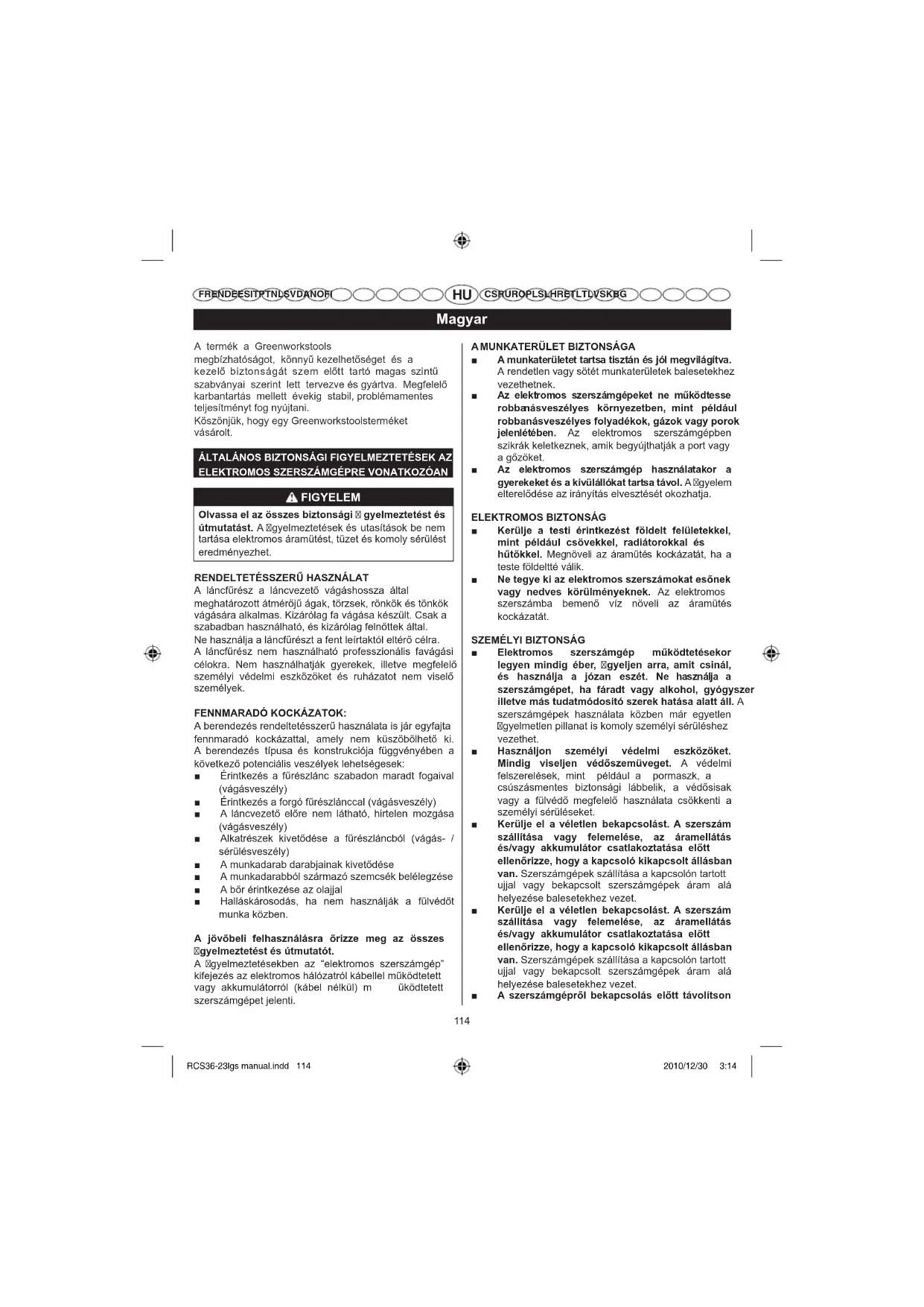 leselejtezett elektromos termékeket nem lehet a háztartási hulladékkal együtt kidobni. Ha van rá lehetőség, akkor hasznosítsa újra. Az újrahasznosítással kapcsolatos tudnivalókról érdeklődjön a helyi önkormányzatnál vagy a forgalmazónál. Az akkumulátor Önre és a környezetre veszélyes anyagot tartalmaz. Ezért ezt külön el kell távolítani és meg kell semmisíteni egy lítium-ion akkumulátorokat feldolgozó létesítményben. RCS36-23lgs manual.indd 124 2010/12/30 3:14125 Čeština FR EN DE ES IT PT NL SV DA NO FI HU RU RO PL SL HR ET LT LV SK BG Váš výrobek byl navržen a vyroben ve vysokém standardu společnosti Greenworkstools pro spolehlivou, snadnou a bezpenou obsluhu. Pokud se o něj budete č dobře starat, poskytne vám mnoho let stabilní bezporuchový výkon. Děkujeme vám za nákup výrobku firmy Greenworkstools. O B E C N Á B E Z P E Č N O S T N Í VA R O V Á N Í