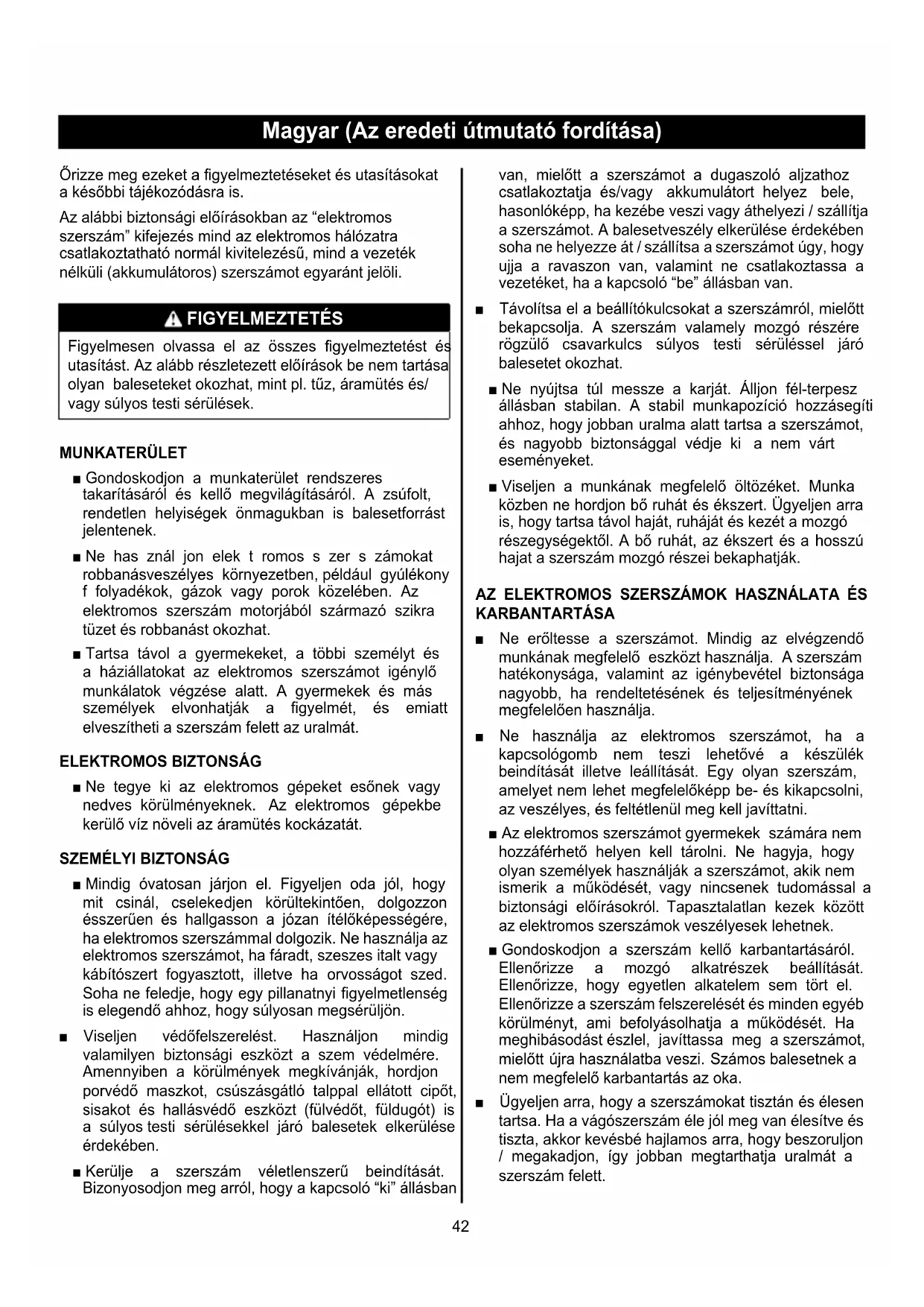 Älä hävitä raaka-aineita jätteinä vaan vie ne kierrätykseen. Ympäristönsuojelun kannalta työkalu, lisäva r usteet ja pakkausmateriaali on lajiteltava.42 43 Magyar (Az eredeti útmutató fordítása) Magyar (Az eredeti útmutató fordítása) Őrizze meg ezeket a gyelmeztetéseket és utasításokat a későbbi tájékozódásra is. Az alábbi biztonsági előírásokban az “elektromos szerszám” kifejezés mind az elektromos hálózatra csatlakoztatható normál kivitelezésű, mind a vezeték nélküli (akkumulátoros) szerszámot egyaránt jelöli. FIGYELMEZTETÉS Figyelmesen olvassa el az összes gyelmeztetést és utasítást. Az alább részletezett előírások be nem tartása olyan baleseteket okozhat, mint pl. tűz, áramütés és/ vagy súlyos testi sérülések. MUNKATERÜLET ■ Gondoskodjon a munkaterület rendszeres takarításáról és kellő megvilágításáról. A zsúfolt, rendetlen helyiségek önmagukban is balesetforrást jelentenek. ■ Ne has znál jon elek t romos s zer s zámokat robbanásveszélyes környezetben, például gyúlékony f folyadékok, gázok vagy porok közelében. Az elektromos szerszám motorjából származó szikra tüzet és robbanást okozhat. ■ Tartsa távol a gyermekeket, a többi személyt és a háziállatokat az elektromos szerszámot igénylő munkálatok végzése alatt. A gyermekek és más személyek elvonhatják a figyelmét, és emiatt elveszítheti a szerszám felett az uralmát.