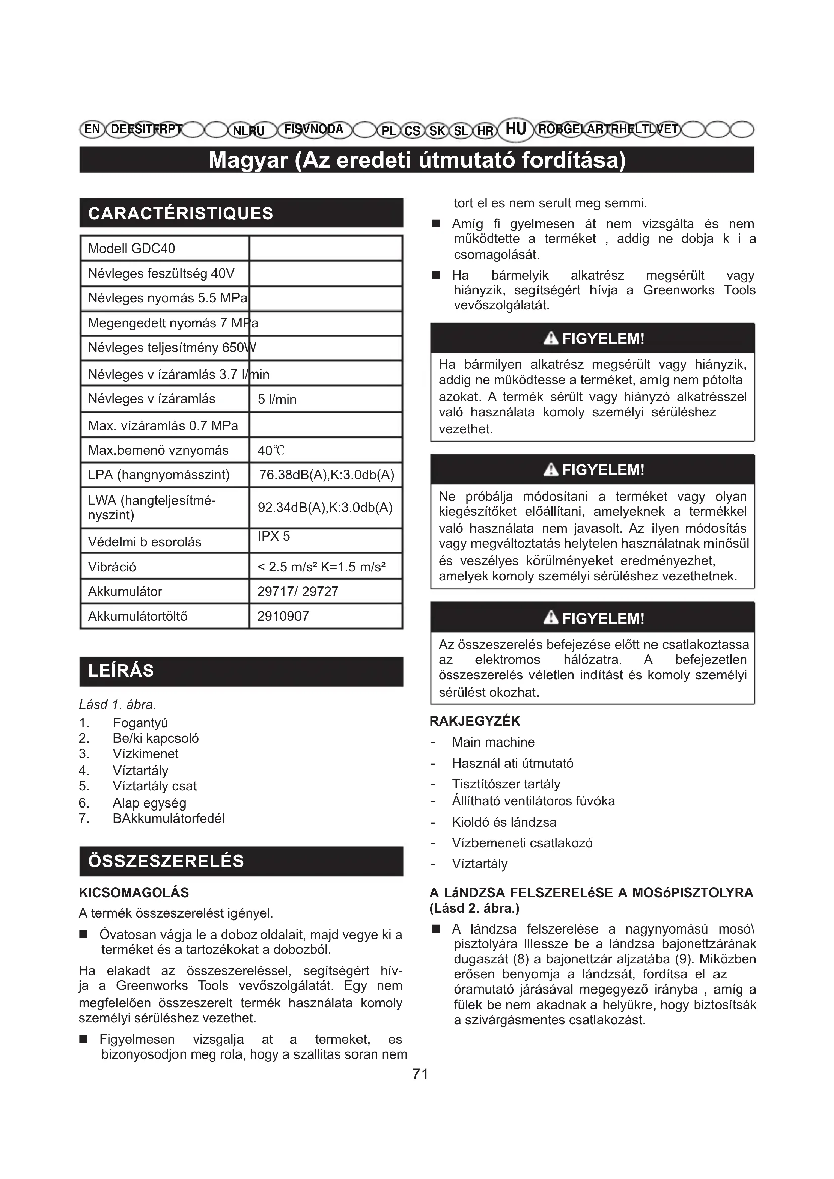 ÖSSZESZERELÉS KICSOMAGOLÁS A termék összeszerelést igényel. Óvatosan vágja le a doboz oldalait, majd vegye ki a terméket és a tartozékokat a dobozból. Ha elakadt az összeszereléssel, segítségért hív- ja a Greenworks Tools vevőszolgálatát. Egy nem megfelelően összeszerelt termék használata komoly személyi sérüléshez vezethet. Figyelmesen vizsgalja at a termeket, es bizonyosodjon meg rola, hogy a szallitas soran nem tort el es nem serult meg semmi. Amíg fi gyelmesen át nem vizsgálta és nem működtette a terméket , addig ne dobja k i a csomagolását. Ha bármelyik alkatrész megsérült vagy hiányzik, segítségért hívja a Greenworks Tools vevőszolgálatát. FIGYELEM! Ha bármilyen alkatrész megsérült vagy hiányzik, addig ne működtesse a terméket, amíg nem pótolta azokat. A termék sérült vagy hiányzó alkatrésszel való használata komoly személyi sérüléshez vezethet. FIGYELEM! Ne próbálja módosítani a terméket vagy olyan kiegészítőket előállítani, amelyeknek a termékkel való használata nem javasolt. Az ilyen módosítás vagy megváltoztatás helytelen használatnak minősül és veszélyes körülményeket eredményezhet, amelyek komoly személyi sérüléshez vezethetnek. FIGYELEM! Az összeszerelés befejezése előtt ne csatlakoztassa az elektromos hálózatra. A befejezetlen összeszerelés véletlen indítást és komoly személyi sérülést okozhat. RAKJEGYZÉK - Main machine - Használ ati útmutató - Tisztítószer tartály - Állítható ventilátoros fúvóka - Kioldó és lándzsa - Vízbemeneti csatlakozó - Víztartály A LáNDZSA FELSZERELéSE A MOSóPISZTOLYRA (Lásd 2. ábra.) A lándzsa felszerelése a nagynyomású mosó\ pisztolyára Illessze be a lándzsa bajonettzárának dugaszát (8) a bajonettzár aljzatába (9). Miközben erősen benyomja a lándzsát, fordítsa el az óramutató járásával megegyező irányba , amíg a fülek be nem akadnak a helyükre, hogy biztosítsák a szivárgásmentes csatlakozást.72 Magyar (Az eredeti útmutató fordítása)