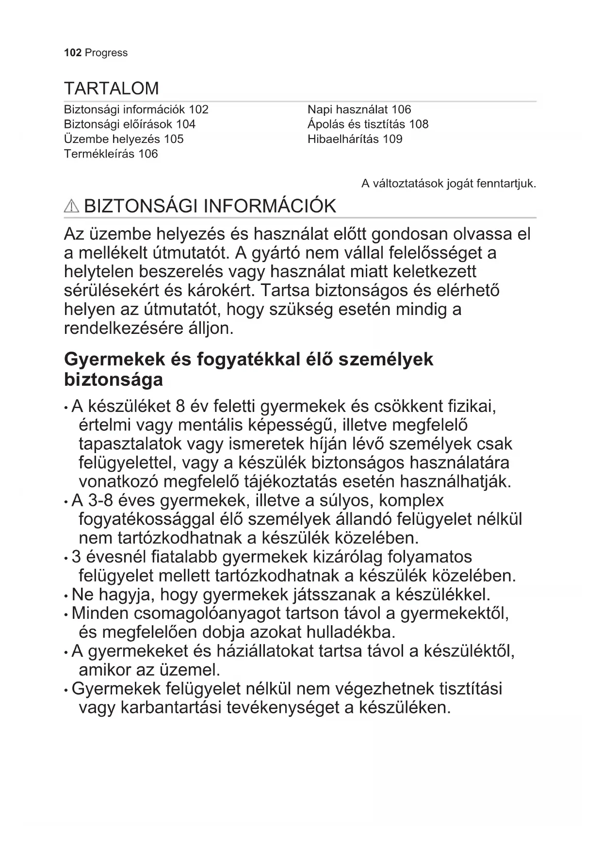 - Gyermekek felügyelet nélkül nem végezhetnek tisztítási vagy karbantartási tevékenységet a készüléken. 102 ProgressÁltalános biztonság