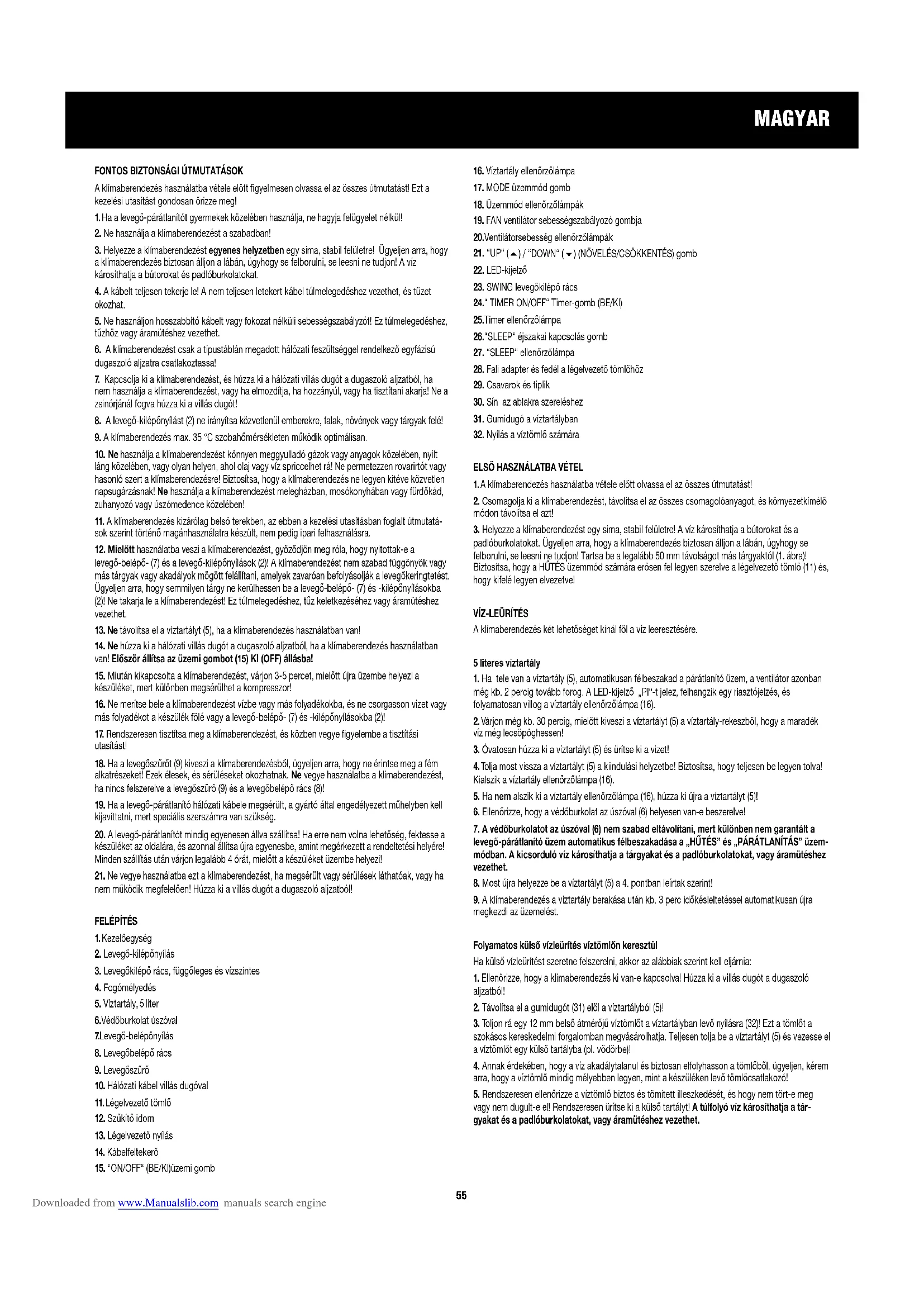 a klímaberendezés biztosan álljon a lábán, úgyhogy se felborulni, se leesni ne tudjon! A víz károsíthatja a bútorokat és padlóburkolatokat.