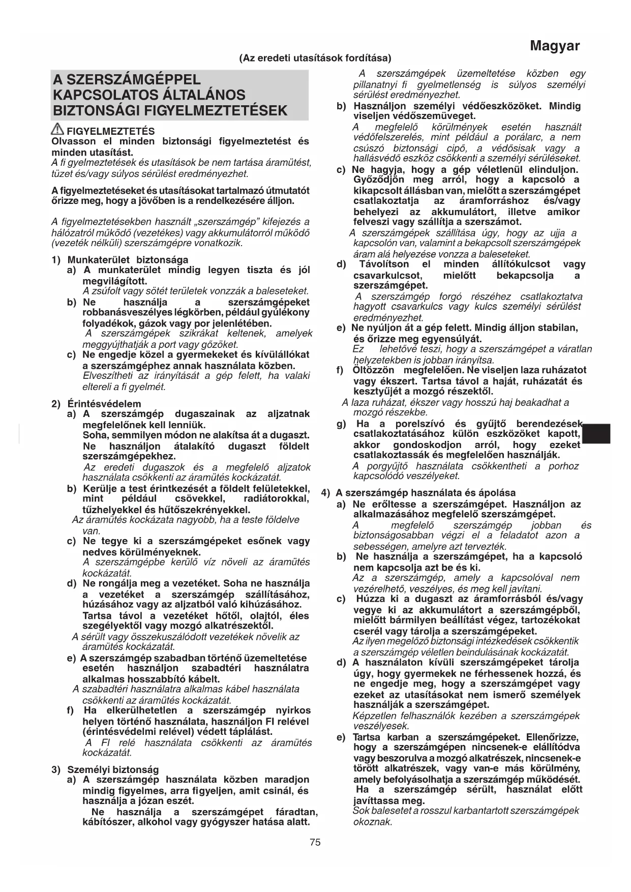 a) A szerszámgép használata közben maradjon mindig fi gyelmes, arra fi gyeljen, amit csinál, és használja a józan eszét. Ne használja a szerszámgépet fáradtan, kábítószer, alkohol vagy gyógyszer hatása alatt. (Az eredeti utasítások fordítása) 0000BookG18SH2.indb750000BookG18SH2.indb75 2016/06/2316:47:532016/06/2316:47:5376 Magyar f) A vágószerszámokat tartsa élesen és tisztán. Az éles vágóélekkel rendelkező, megfelelően karbantartott vágószerszámok kevésbé valószínű, hogy elakadnak, és könnyebben kezelhetők.