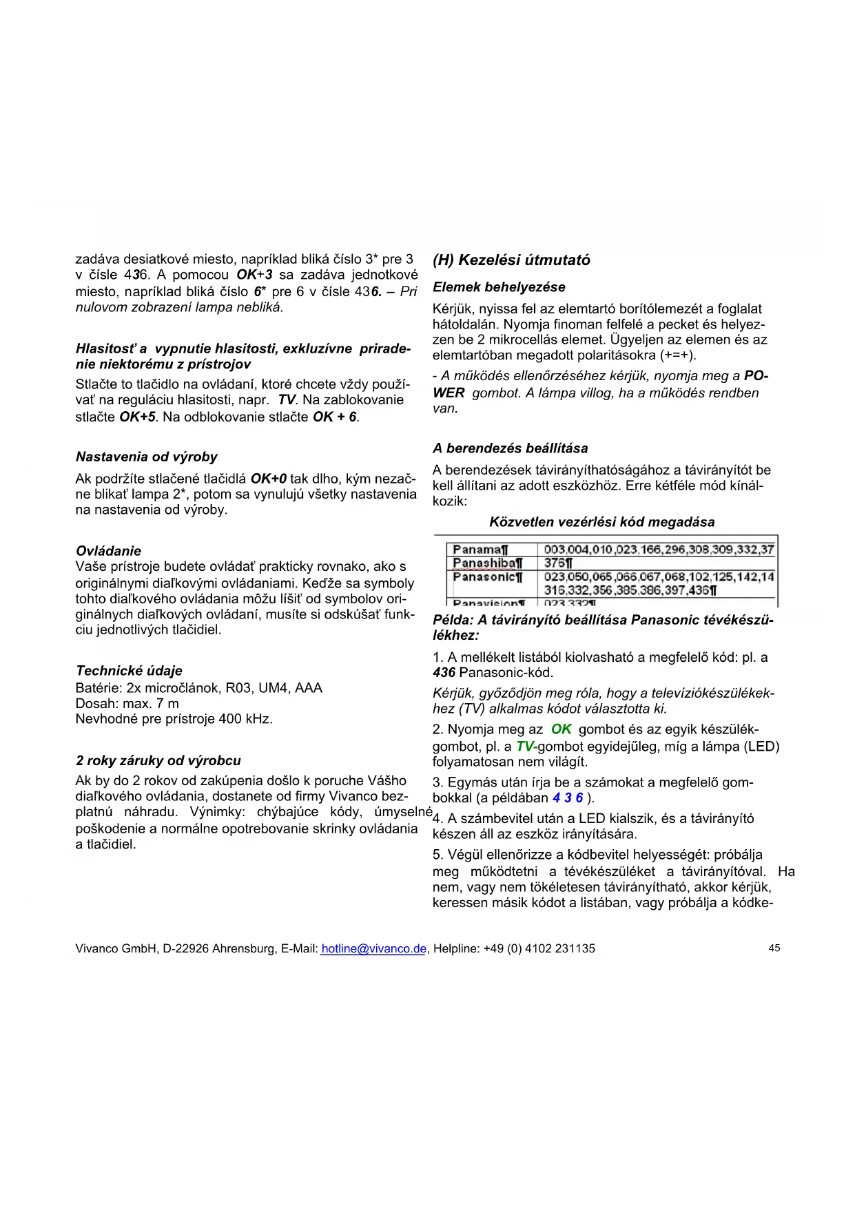 2, vagy 3 gombot, attól függően, hogy a kód mely szám- jegyét kívánja kiolvasni. Ha pl. megnyomja az OK+1 gombokat, és a 4 3 6 példakódot állította be, a lámpa négyszer villog a százas helyiértékű 4 számérték jelzé- Vivanco GmbH, D-22926 Ahrensburg, E-Mail: hotline@vivanco.de, Helpline: +49 (0) 4102 231135 46sére. Így Önnek csupán számolnia kell. Az OK+2 meg- nyomásával a berendezés a tízes helyiértéket mutatja, pl. a 436 kódban lévő 3-as számjegy mutatására három- szor villog. Az OK+3 megnyomásával a berendezés az egyes helyiértékű számjegyet mutatja. Például a 436 kódban lévő 6-os számjegy mutatásához hatszor villog. – A nulla kijelzésekor a berendezés nem villog. A hangerő és a némítás egyetlen készülékhez való hozzárendelése Nyomja meg azon készülék gombját, amelyet kizáróla- gosan szeretne hangerőszabályzásra használni. A pél- dában legyen ez a TV. A hozzárendeléshez nyomja le egyszerre a OK+ 5 gombot. A hozzárendelés törléséhez nyomja le egyszerre a OK+ 6 gombot. Gyári beállítások Ha az OK+0 gombot addig nyomja, míg a lámpa 2-szer villog, a berendezés visszaáll a gyári beállítási értékek- re. Használat A készülékek gyakorlatilag ugyanúgy távirányíthatóak, mint az eredeti távirányítóval. Az univerzális távirányító szimbólumai különbözhetnek az eredetiétől, így szükség szerint próbálja végig mindegyik gomb működését. Műszaki adatok Elemek: 2x R03, UM4, AAA elem Hatótávolság: max. 7 m 400 kHz-es eszközökhöz nem használható 2 éves gyári garancia Ha az Ön univerzális távirányítója a vásárlástól számí- tott 2 éven belül meghibásodik, akkor a Vivanco díjmen- tesen kicseréli azt. Kivételek: hiányzó kódok, szándékos rongálás, illetve a tokozás és a gombok normális kopá- sa. Vivanco GmbH, D-22926 Ahrensburg, E-Mail: hotline@vivanco.de, Helpline: +49 (0) 4102 231135