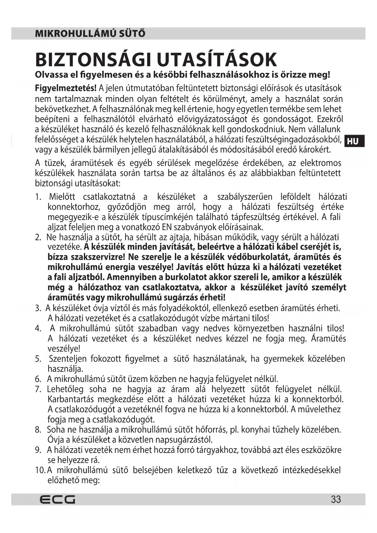- Mint a legtöbb sūtō esétében, a készülékházban keletkezǒ tuz elkerülése érdekében a biztonsági utasítások szigó betartására van szükség.
