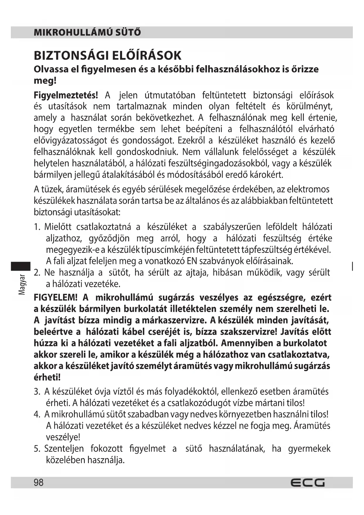 Töltse le az útmutatót a következőhöz Mikrohullámú sütő PDF formátumban ingyenesen! Találja meg kézikönyvét MTM 2070 W - ECG és vegye vissza elektronikus eszközét a kezébe. Ezen az oldalon közzé van téve az eszköze használatához szükséges összes dokumentum. MTM 2070 W márka ECG.