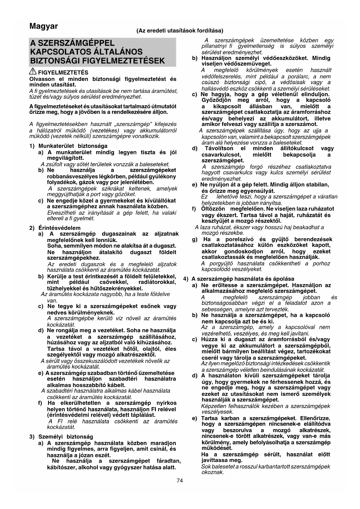 a) A szerszámgép használata közben maradjon mindig fi gyelmes, arra fi gyeljen, amit csinál, és használja a józan eszét. Ne használja a szerszámgépet fáradtan, kábítószer, alkohol vagy gyógyszer hatása alatt. (Az eredeti utasítások fordítása) 00BookG10SQ2.indb7400BookG10SQ2.indb74 2019/07/0110:00:112019/07/0110:00:1175 Magyar f) A vágószerszámokat tartsa élesen és tisztán. Az éles vágóélekkel rendelkező, megfelelően karbantartott vágószerszámok kevésbé valószínű, hogy elakadnak, és könnyebben kezelhetők. g) A szerszámgép tartozékait és betétkéseit stb. használja a jelen útmutatónak megfelelően, fi gyelembe véve a munkakörülményeket és a végzendő munkát. A szerszámgép nem rendeltetésszerű használata veszélyes helyzetet eredményezhet.