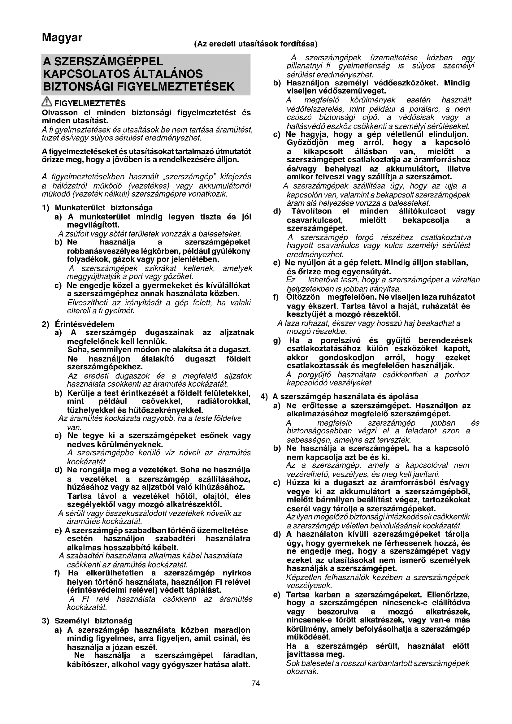 FIGYELMEZTETÉS Olvasson el minden biztonsági fi gyelmeztetést és minden utasítást. A fi gyelmeztetések és utasítások be nem tartása áramütést, tüzet és/vagy súlyos sérülést eredményezhet. A fi gyelmeztetéseket és utasításokat tartalmazó útmutatót őrizze meg, hogy a jövőben is a rendelkezésére álljon. A fi gyelmeztetésekben használt „szerszámgép” kifejezés a hálózatról működő (vezetékes) vagy akkumulátorról működő (vezeték nélküli) szerszámgépre vonatkozik.