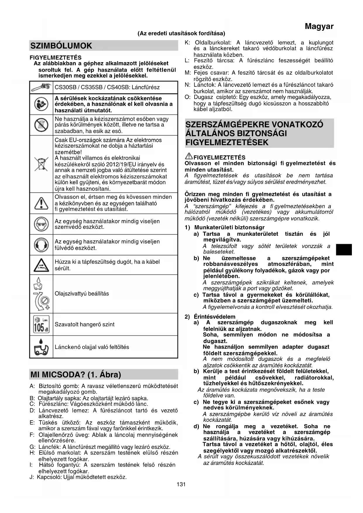 Zadeklarowana łączna wartość wibracji została zmierzona zgodnie ze standardową metodą testową i może być wykorzystana do porównania narzędzi. Może być także wykorzystana do wstępnej oceny ekspozycji. OSTRZEŻENIE ○ Emisjia wibracji podczas pracy narzędzia elektrycznego może różnić się od zadeklarowanej łącznej wartości w zależności od sposobu wykorzystywania narzędzia. ○ Określ środki bezpieczeństwa wymagane do ochrony operatora zgodnie z szacowaną wartością narażenia na zagrożenie w zależności od rzeczywistych warunków użytkowania (uwzględniając wszystkie etapy cyklu roboczego, a także przerwy w pracy urządzenia oraz praca w trybie gotowości). WSKAZÓWKA W zwiazku z prowadzonym przez HiKOKI programem badań i rozwoju, specyfi kacje te mogą się zmienić w każdej chwili bez uprzedzenia. 0000BookCS30SB.indb1300000BookCS30SB.indb130 2019/06/1410:09:282019/06/1410:09:28131 Magyar SZIMBÓLUMOK FIGYELMEZTETÉS Az alábbiakban a géphez alkalmazott jelöléseket soroltuk fel. A gép használata előtt feltétlenül ismerkedjen meg ezekkel a jelölésekkel. CS30SB / CS35SB / CS40SB: Láncfűrész A sérülések kockázatának csökkentése érdekében, a használónak el kell olvasnia a használati útmutatót. Ne használja a kéziszerszámot esőben vagy párás körülmények között, illetve ne tartsa a szabadban, ha esik az eső. Csak EU-országok számára Az elektromos kéziszerszámokat ne dobja a háztartási szemétbe! A használt villamos és elektronikai készülékekről szóló 2012/19/EU irányelv és annak a nemzeti jogba való átültetése szerint az elhasznált elektromos kéziszerszámokat külön kell gyűjteni, és környezetbarát módon újra kell hasznosítani. Olvasson el, értsen meg és kövessen minden a kézikönyvben és az egységen található fi gyelmeztetést és utasítást. Az egység használatakor mindig viseljen szemvédő eszközt. Az egység használatakor mindig viseljen fülvédő eszközt. Húzza ki a tápfeszültség dugót, ha a kábel sérült. Olajszivattyú beállítás Szavatolt hangerő szint Lánckenő olajjal való feltöltés MI MICSODA? (1. Ábra) A: Biztosító gomb: A ravasz véletlenszerű működtetését megakadályozó gomb. B: Olajtartály sapka: Az olajtartájt lezáró sapka. C: Fűrészlánc: Vágóeszközként működő lánc. D: Láncvezető lemez: A fűrészláncot tartó és vezető alkatrész. E: Tüskés ütköző: Az eszköz támaszként működik, amikor a szerszám fával vagy farönkkel érintkezik. F: Olajellenőrző üveg: Ablak a láncolaj mennyiségének ellenőrzésére. G: Láncfék: A láncfűrészt megállító vagy lezáró eszköz. H: Elülső markolat: A szerszám testének elülső részén elhelyezett fogókar. I: Hátsó fogantyú: A szerszám testének felső részén elhelyezett fogókar. J: Kapcsoló: Ujjal működtetett eszköz. K: Oldalburkolat: A láncvezető lemezt, a kuplungot és a lánckereket takaró védőburkolat a láncfűrész használata közben. L: Feszítő tárcsa: A fűrészlánc feszességét beállító eszköz. M: Fejes csavar: A feszítő tárcsát és az oldalburkolatot rögzítő eszköz. N: Lánctok: A láncvezető lemezt és a fűrészláncot takaró burkolat, amikor az szerszámot nem használják. O: Dugasz csíptető: Egy eszköz, amely megakadályozza, hogy a tápfeszültség dugó kicsússzon a hosszabbító kábel aljzatból.