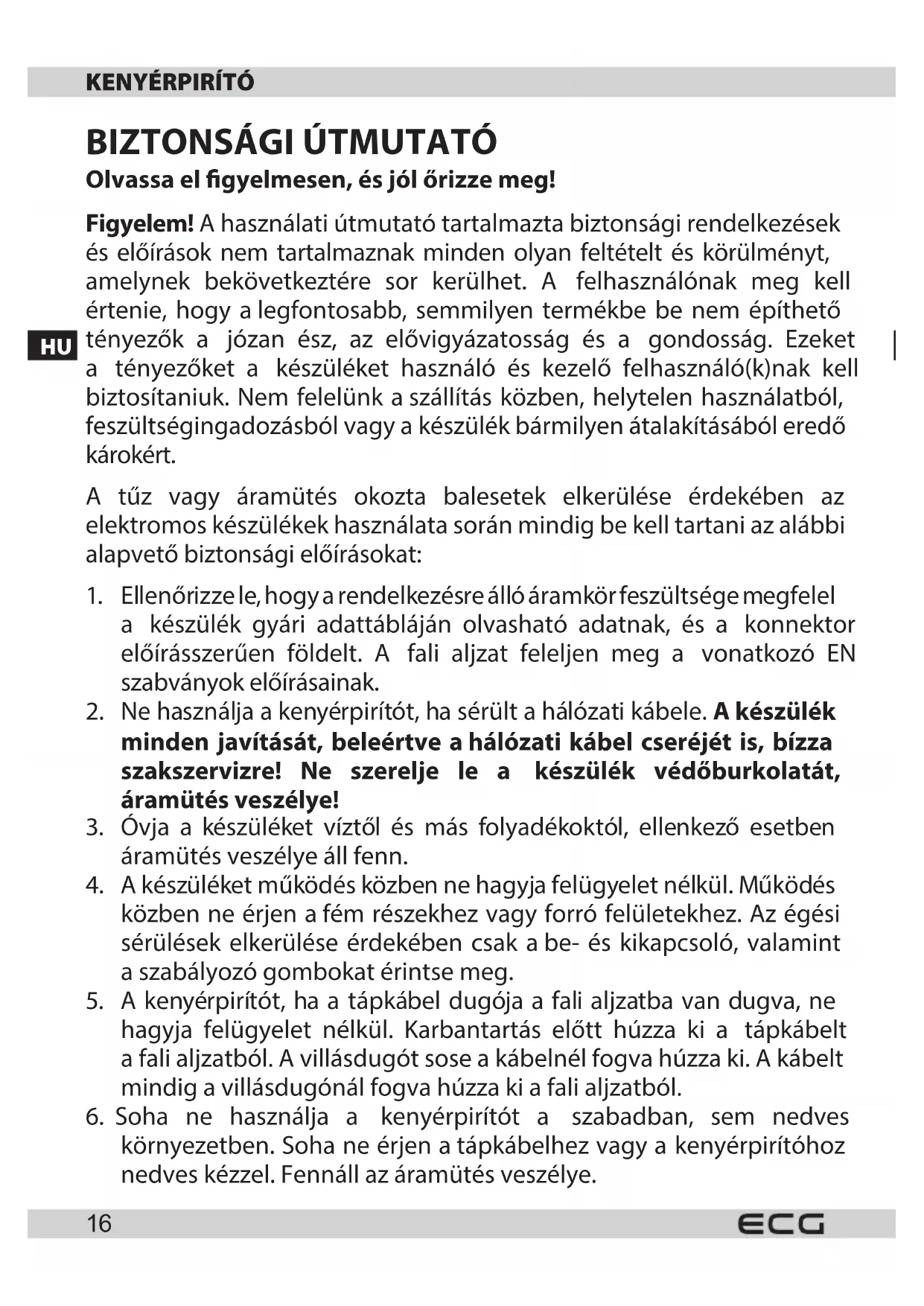 - A kenyérpirítót, ha a pátkábel dugója a fali aljatba van dugva, ne hagyja felügyelet nélkül. Karbantartás elöttt húzza ki a pátkábelt a fali aljzataból. A villásdugót sose a kábelnél fogva húzza ki. A kábelt mindig a villásdugónal fogva húzza ki a fali aljzataból.