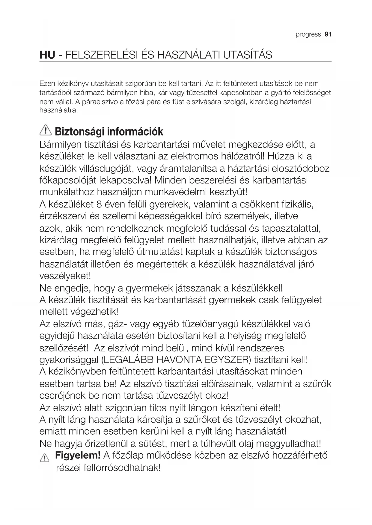 T1 Przycisk prędkość (moc) zasysania 1 T2 Przycisk prędkość (moc) zasysania 2 T3 Przycisk prędkość (moc) zasysania 3 T4 Przycisk ON/OFF prędkość (moc) zasysania 4 Uwaga: Prędkość (moc) zasysania 4 działa przez 5 minut, a następnie powraca do wcześniejszego ustawienia. T5 Przycisk kontroli nasycenia filtrów T6 Przycisk OFF prędkość Przycisk włączenie/wyłączenie panelu kontrolnego T7 Przycisk ON/OFF oświetlenia Przycisk włączenie/wyłączenie kontroli nasycenia filtra węglowego Funkcja opóźnionego wyłączenia prędkości (mocy) zasysania: Wybrać pożądaną prędkość i wcisnąć jeszcze raz ten sam przycisk przez dłużej niż 2 sek., przycisk migocze, aby wskazać uruchomienie działania. Wcisnąć ponownie, aby wyłączyć funkcję. Wybrana prędkość wyłącza się po: Prędkość (moc) zasysania 1: 20 minutach Prędkość (moc) zasysania 2: 15 minutach Prędkość (moc) zasysania 3: 10 minutach Prędkość (moc) zasysania 4: 5 minutach Funkcja Włączenia – Wyłączenia panelu kontrolnego Wcisnąć przycisk T6 przez ponad 5 sekund Funkcja Włączenia – Wyłączenia kontroli nasycenia ltra węglowego Przy okapie wyłączonym wcisnąć przycisk T7 przez ponad 5 sekund. Przycisk T5 migocze: 2 razy, aby wskazać, że kontrola nasycenia filtra węglowego została włączona 1 raz, aby wskazać, że kontrola nasycenia filtra węglowego została wyłączona Funkcja kontrola i reset nasycenia ltrów W regularnych odstępach czasu, w zależności od czasu używania okapu przycisk T5 zaświeci się, aby wskazać, że należy przeprowadzić konserwację filtrów, zgodnie z instrukcjami zawartymi w odnośnych paragrafach. Przycisk T5 włączony przy stałym świetle: należy dokonać konserwacji filtra przeciwtłuszczowego Przycisk T5 włączony przy świetle migoczącym: należy dokonać konserwacji filtra węglowego. Reset wskaźnika nasycenia ltrów: Przy wyłączonym okapie wcisnąć przycisk T5 przez ponad 2 sek. Powtórzyć czynność, jeśli to konieczne.90 progress Hob2Hood Okap jest wyposażony w funkcję połączenia bezprzewodowego (wireless) z płytą go gotowania w celu automatycznego regulowania najbardziej odpowiedniej prędkości. Należy zapoznać się z instrukcją obsługi płyty do gotowania, aby zweryfikować obecność i kompatybilność tej funkcji. W przypadku pierwszego podłączenia do sieci elektrycznej albo nagłego odłączenia prądu elektrycznego (blackout) należy odczekać 1 minutę, aby okap mógł powrócić do stanu początkowego połączenia z płytą do gotowania. Oświetlenie Okap zaopatrzony jest w system oświetlenia, który bazuje się na technologii LED. LED gwarantują optymalne oświetlenie, trwałość 10 razy większą od lamp tradycyjnych i pozwalają zaoszczędzić 90% energii elektrycznej. Uwaga! Nie patrzeć bezpośrednio na światło pochodzące z LED. Aby wymienić lampy, należy skontaktować się z autoryzowanym centrum obsługi w sprawie części zamiennych.progress 91 HU - FELSZERELÉSI ÉS HASZNÁLATI UTASÍTÁS Ezen kézikönyv utasításait szigorúan be kell tartani. Az itt feltüntetett utasítások be nem tartásából származó bármilyen hiba, kár vagy tűzesettel kapcsolatban a gyártó felelősséget nem vállal. A páraelszívó a főzési pára és füst elszívására szolgál, kizárólag háztartási használatra. Biztonsági információk Bármilyen tisztítási és karbantartási művelet megkezdése előtt, a készüléket le kell választani az elektromos hálózatról! Húzza ki a készülék villásdugóját, vagy áramtalanítsa a háztartási elosztódoboz főkapcsolóját lekapcsolva! Minden beszerelési és karbantartási munkálathoz használjon munkavédelmi kesztyűt! A készüléket 8 éven felüli gyerekek, valamint a csökkent zikális, érzékszervi és szellemi képességekkel bíró személyek, illetve azok, akik nem rendelkeznek megfelelő tudással és tapasztalattal, kizárólag megfelelő felügyelet mellett használhatják, illetve abban az esetben, ha megfelelő útmutatást kaptak a készülék biztonságos használatát illetően és megértették a készülék használatával járó veszélyeket! Ne engedje, hogy a gyermekek játsszanak a készülékkel! A készülék tisztítását és karbantartását gyermekek csak felügyelet mellett végezhetik! Az elszívó más, gáz vagy egyéb tüzelőanyagú készülékkel való egyidejű használata esetén biztosítani kell a helyiség megfelelő szellőzését! Az elszívót mind belül, mind kívül rendszeres gyakorisággal (LEGALÁBB HAVONTA EGYSZER) tisztítani kell! A kézikönyvben feltüntetett karbantartási utasításokat minden esetben tartsa be! Az elszívó tisztítási előírásainak, valamint a szűrők cseréjének be nem tartása tűzveszélyt okoz! Az elszívó alatt szigorúan tilos nyílt lángon készíteni ételt! A nyílt láng használata károsítja a szűrőket és tűzveszélyt okozhat, emiatt minden esetben kerülni kell a nyílt láng használatát! Ne hagyja őrizetlenül a sütést, mert a túlhevült olaj meggyulladhat! Figyelem! A főzőlap működése közben az elszívó hozzáférhető részei felforrósodhatnak!92 progress Biztonsági utasítások Az izzó cseréjéhez kizárólag az e kézikönyv „karbantartás izzó cseréje” c. részben megadott típusú izzót használjon! Figyelem! Ne csatlakoztassa a készüléket az elektromos hálózatra, amíg a beszerelést teljesen el nem végezte! A füstelvezetéshez szükséges műszaki és biztonsági intézkedéseket illetően, az illetékes helyi hatóságok vonatkozó rendeleteit szigorúan tartsa be! A keringetett levegőt nem szabad a gáz vagy egyéb égéstermék üzemű készülékek füstjének elvezetéshez használt csőben szállítani! Ne használja az elszívót helytelenül felszerelt lámpával, illetve ne hagyja azt lámpa nélkül, mert áramütést okozhat! Soha ne használja az elszívót felszerelt ros