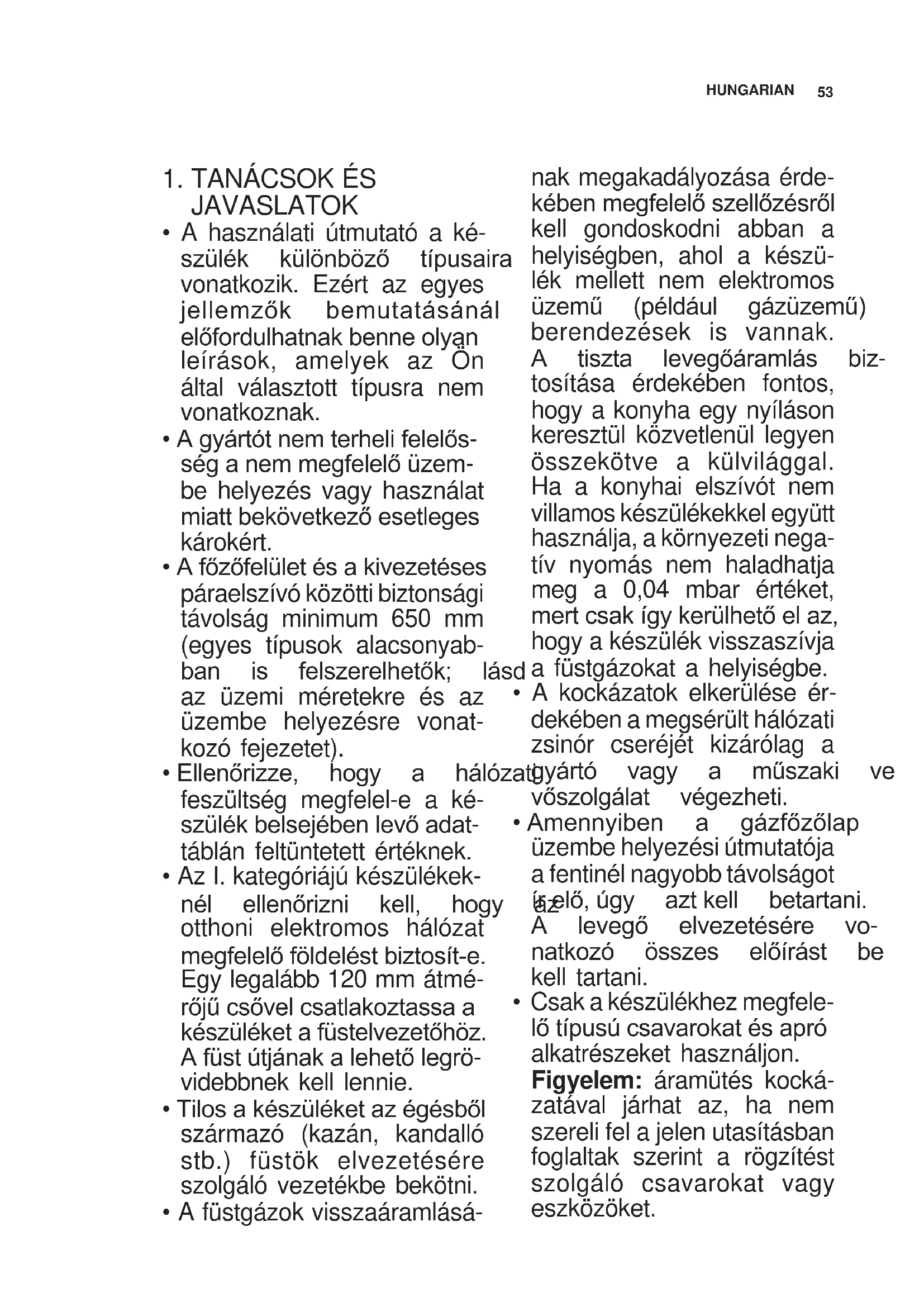 - A füstgázok visszaáramlásá- nak megakadályozása érde- NpEHQPHJIHOHOĘV]HOOĘ]pVUĘO kell gondoskodni abban a helyiségben, ahol a készü- lék mellett nem elektromos ]HPĦ SpOGiXO Ji]]HPĦ berendezések is vannak. $ WLV]WD OHYHJĘiUDPOiV EL]- tosítása érdekében fontos, hogy a konyha egy nyíláson keresztül közvetlenül legyen összekötve a külvilággal. Ha a konyhai elszívót nem villamos készülékekkel együtt használja, a környezeti nega- tív nyomás nem haladhatja meg a 0,04 mbar értéket, PHUWFVDNtJ\NHUOKHWĘHOD] hogy a készülék visszaszívja a füstgázokat a helyiségbe.