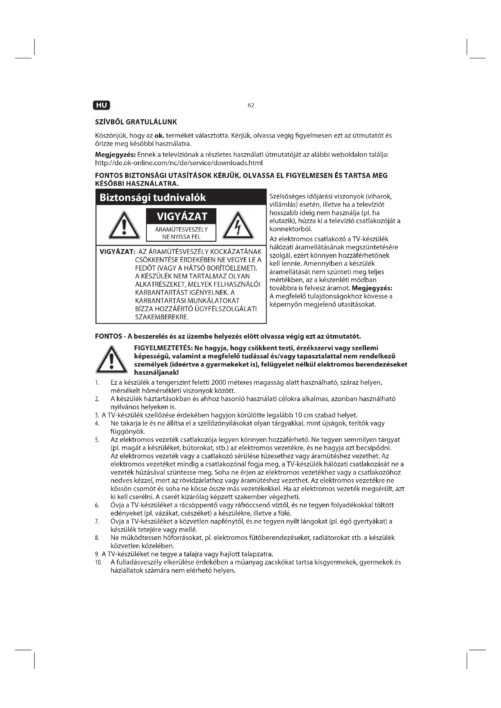 Köszönjük, hogy az ok. termékét választotta. Kérjük, olvassa végig gyelmesen ezt az útmutatót és őrizze meg későbbi használatra. Megjegyzés: Ennek a televíziónak a részletes használati útmutatóját az alábbi weboldalon találja: http://de.ok-online.com/nc/de/service/downloads.html FONTOS BIZTONSÁGI UTASÍTÁSOK KÉRJÜK, OLVASSA EL FIGYELMESEN ÉS TARTSA MEG KÉSŐBBI HASZNÁLATRA. Biztonsági tudnivalók Szélsőséges időjárási viszonyok (viharok, villámlás) esetén, illetve ha a televíziót hosszabb ideig nem használja (pl. ha elutazik), húzza ki a televízió csatlakozóját a konnektorból. Az elektromos csatlakozó a TV-készülék hálózati áramellátásának megszüntetésére szolgál, ezért könnyen hozzáférhetőnek kell lennie. Amennyiben a készülék áramellátását nem szünteti meg teljes mértékben, az a készenléti módban továbbra is felvesz áramot. Megjegyzés: A megfelelő tulajdonságokhoz kövesse a képernyőn megjelenő utasításokat. VIGYÁZAT