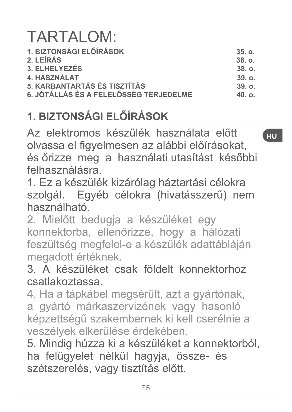 HU6. Ne merítse a készüléket, a tápkábelt vagy a csatlakozó dugaszt vízbe vagy más folyadékba.