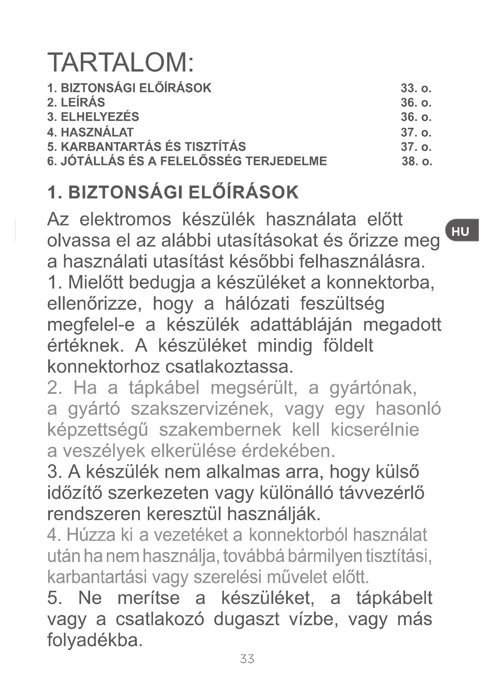 vagy a csatlakozó dugaszt vízbe, vagy más folyadékba. TARTALOM: