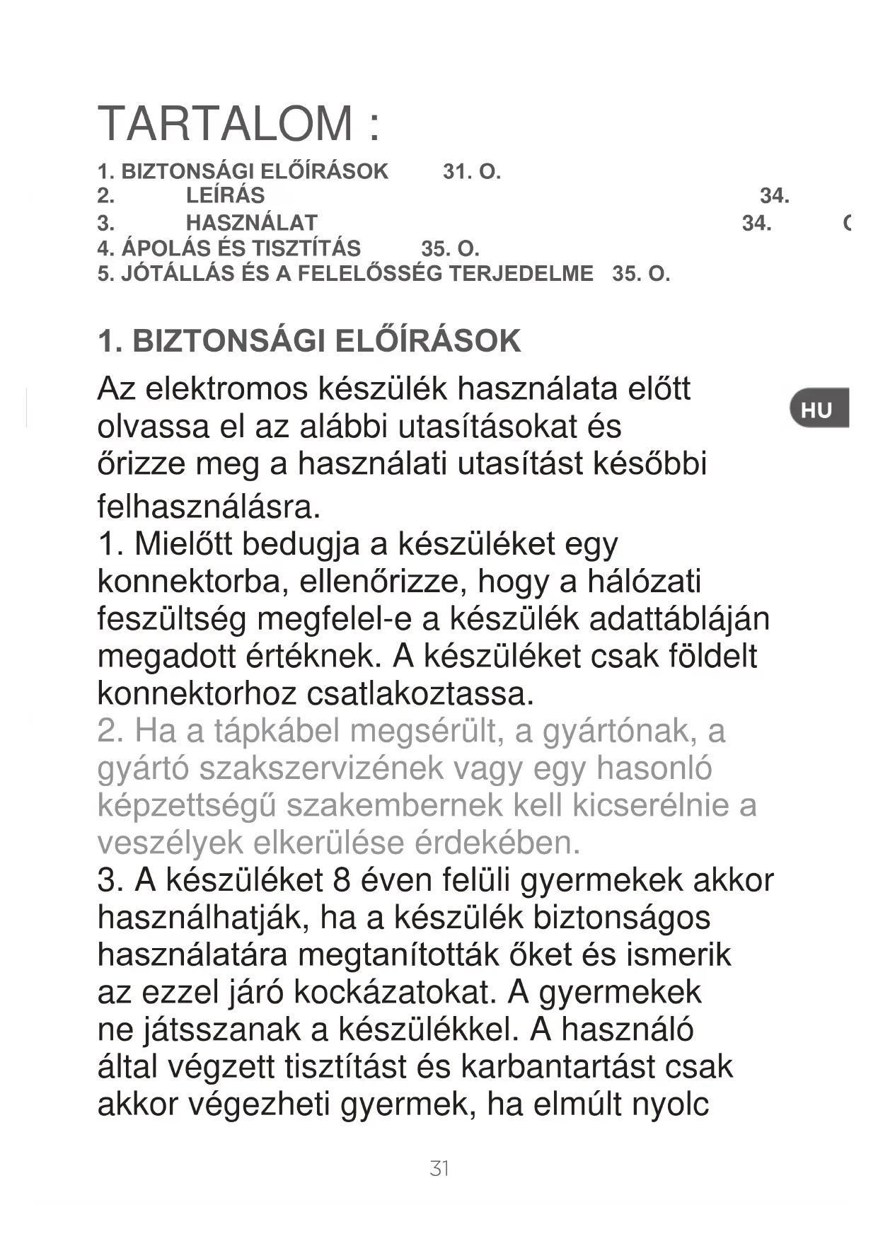 használhatják, ha a készülék biztonságos használatára megtanították őket és ismerik az ezzel járó kockázatokat. A gyermekek ne játsszanak a készülékkel. A használó által végzett tisztítást és karbantartást csak akkor végezheti gyermek, ha elmúlt nyolc TARTALOM :