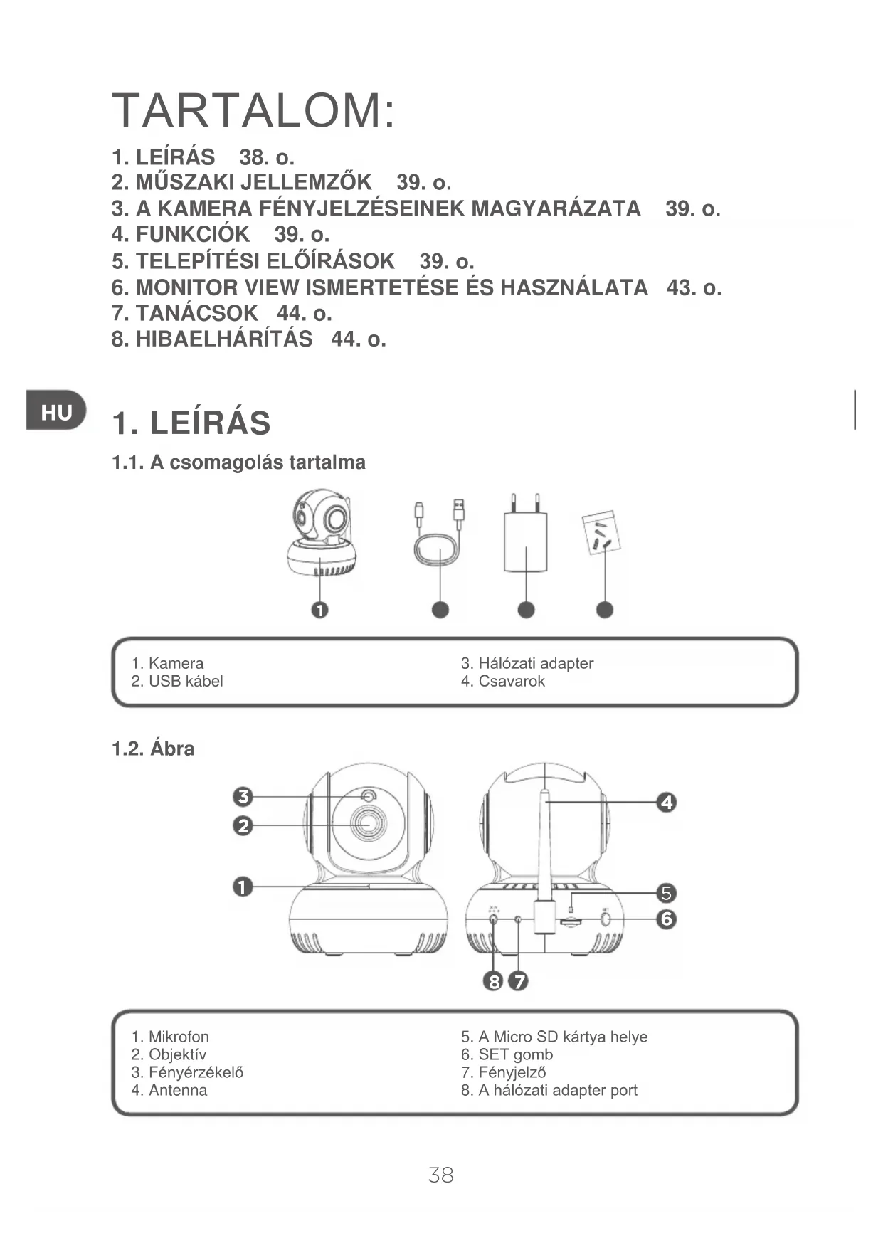 1.1. A csomagolás tartalma 1 2 3 41. Kamera2. USB kábel3. Hálózati adapter4. Csavarok 1.2. Ábra