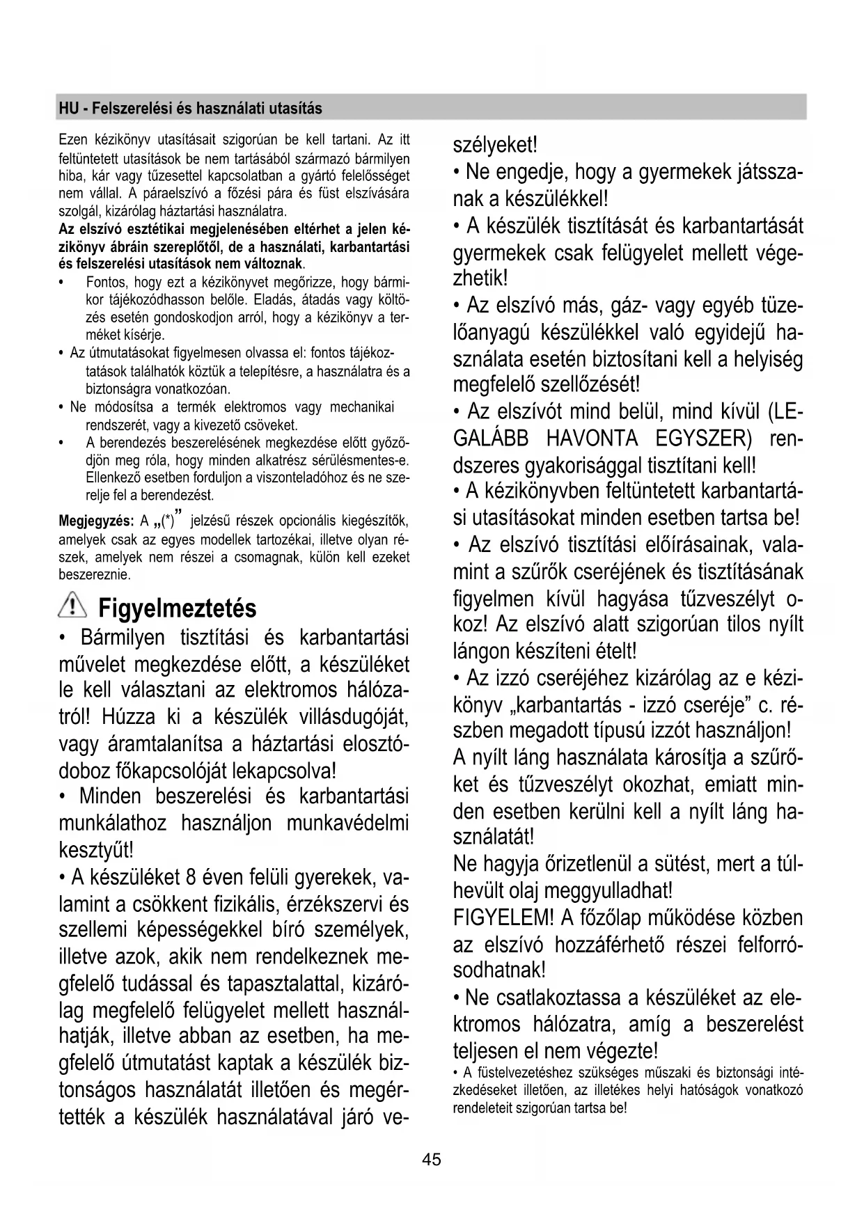- Az elszívót mind belül, mind kívül (LE- GALÁBB HAVONTA EGYSZER) ren- dszeres gyakorisággal tisztítani kell!