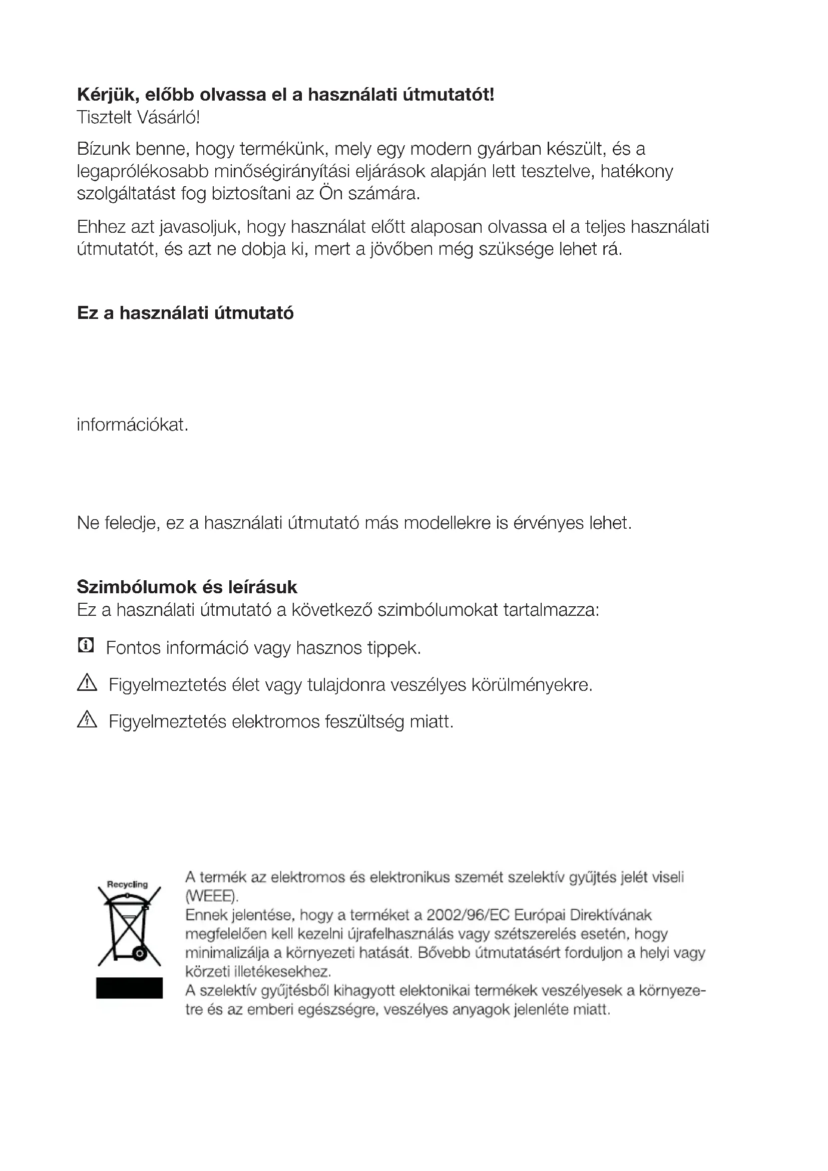- Živila se dotikajo stropa predala. Ponovno razporedite živila v predalu.Kérjük, előbb olvassa el a használati útmutatót! Tisztelt Vásárló! Bízunk benne, hogy termékünk, mely egy modern gyárban készült, és a legaprólékosabb minőségirányítási eljárások alapján lett tesztelve, hatékony szolgáltatást fog biztosítani az Ön számára. Ehhez azt javasoljuk, hogy használat előtt alaposan olvassa el a teljes használati útmutatót, és azt ne dobja ki, mert a jövőben még szüksége lehet rá. Ez a használati útmutató