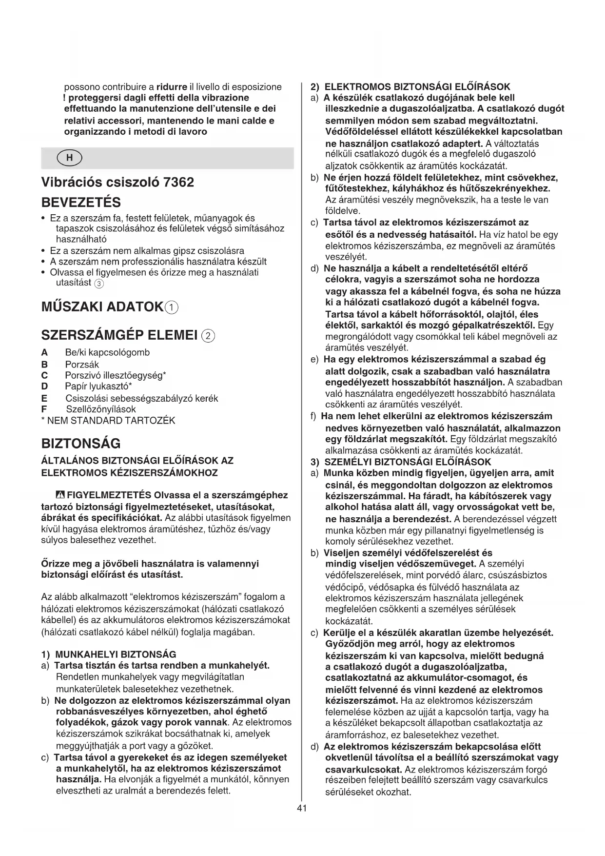 a) Munka közben mindig gyeljen, ügyeljen arra, amit csinál, és meggondoltan dolgozzon az elektromos kéziszerszámmal. Ha fáradt, ha kábítószerek vagy alkohol hatása alatt áll, vagy orvosságokat vett be, ne használja a berendezést. A berendezéssel végzett munka közben már egy pillanatnyi gyelmetlenség is komoly sérülésekhez vezethet. b) Viseljen személyi védőfelszerelést és mindig viseljen védőszemüveget. A személyi védőfelszerelések, mint porvédő álarc, csúszásbiztos védőcipő, védősapka és fülvédő használata az elektromos kéziszerszám használata jellegének megfelelően csökkenti a személyes sérülések kockázatát. c) Kerülje el a készülék akaratlan üzembe helyezését. Győződjön meg arról, hogy az elektromos kéziszerszám ki van kapcsolva, mielőtt bedugná a csatlakozó dugót a dugaszolóaljzatba, csatlakoztatná az akkumulátor-csomagot, és mielőtt felvenné és vinni kezdené az elektromos kéziszerszámot. Ha az elektromos kéziszerszám felemelése közben az ujját a kapcsolón tartja, vagy ha a készüléket bekapcsolt állapotban csatlakoztatja az áramforráshoz, ez balesetekhez vezethet. d) Az elektromos kéziszerszám bekapcsolása előtt okvetlenül távolítsa el a beállító szerszámokat vagy csavarkulcsokat. Az elektromos kéziszerszám forgó részeiben felejtett beállító szerszám vagy csavarkulcs sérüléseket okozhat. possono contribuire a ridurre il livello di esposizione ! proteggersi dagli eetti della vibrazione eettuando la manutenzione dell’utensile e dei relativi accessori, mantenendo le mani calde e organizzando i metodi di lavoro