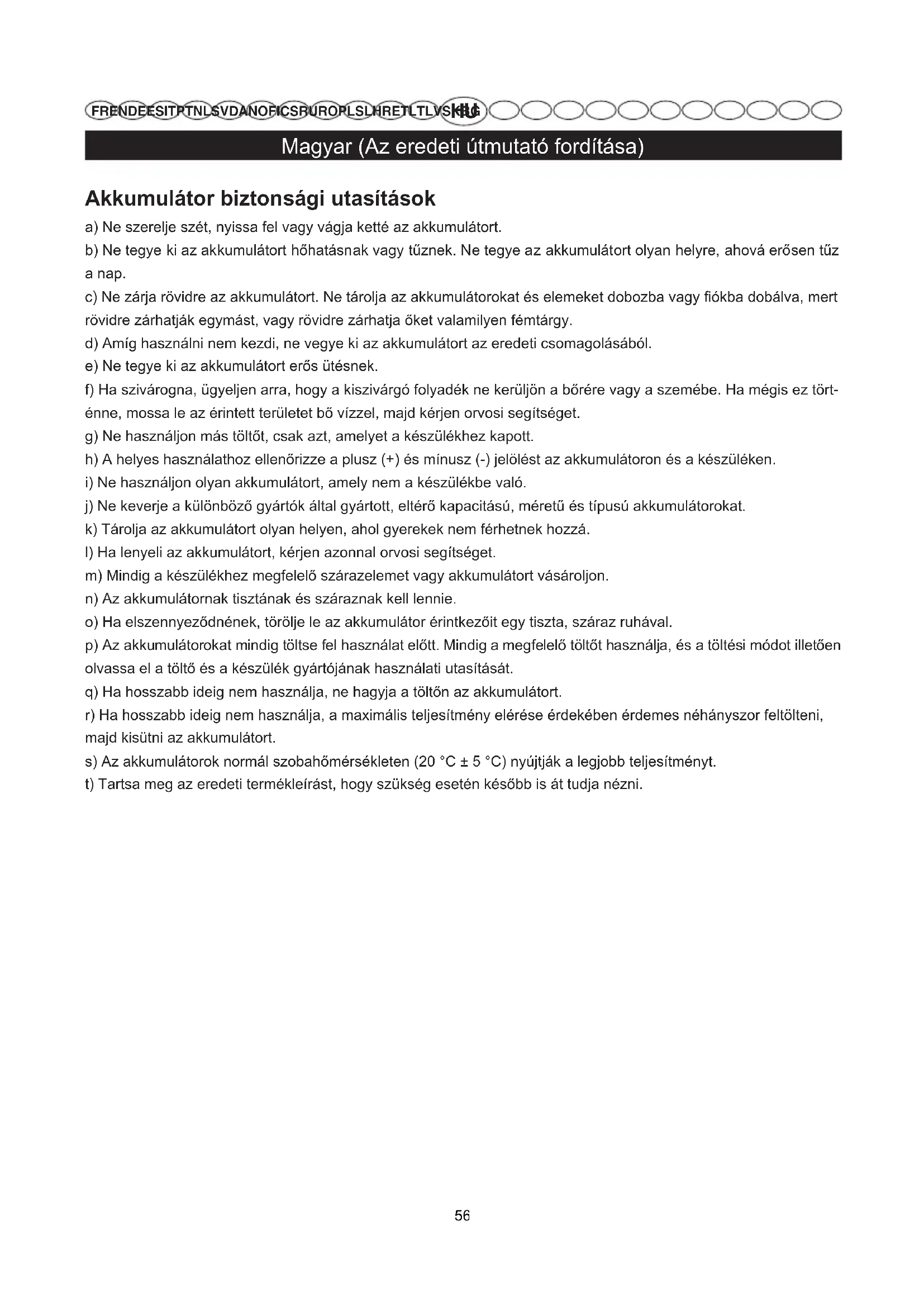 FR EN DE ES I T PT NL S V DA NO HU CS RU RO PL SL HR ET LT LV SK BG Käytä suojalaseja Käytä pölynaamaria Lukko Avaa 55Magyar (Az eredeti útmutató fordítása) Akkumulátor biztonsági utasítások a) Ne szerelje szét, nyissa fel vagy vágja ketté az akkumulátort. b) Ne tegye ki az akkumulátort hőhatásnak vagy tűznek. Ne tegye az akkumulátort olyan helyre, ahová erősen tűz a nap. c) Ne zárja rövidre az akkumulátort. Ne tárolja az akkumulátorokat és elemeket dobozba vagy fiókba dobálva, mert rövidre zárhatják egymást, vagy rövidre zárhatja őket valamilyen fémtárgy. d) Amíg használni nem kezdi, ne vegye ki az akkumulátort az eredeti csomagolásából. e) Ne tegye ki az akkumulátort erős ütésnek. f) Ha szivárogna, ügyeljen arra, hogy a kiszivárgó folyadék ne kerüljön a bőrére vagy a szemébe. Ha mégis ez tört- énne, mossa le az érintett területet bő vízzel, majd kérjen orvosi segítséget. g) Ne használjon más töltőt, csak azt, amelyet a készülékhez kapott. h) A helyes használathoz ellenőrizze a plusz (+) és mínusz (-) jelölést az akkumulátoron és a készüléken.