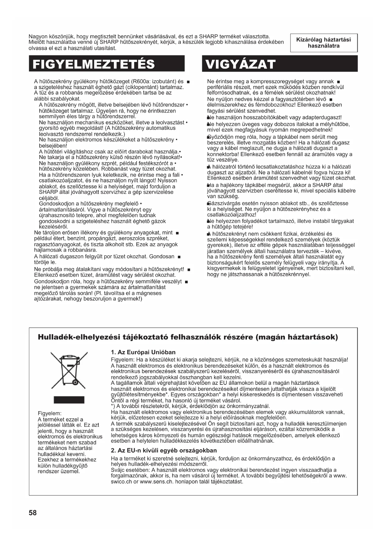 (B246)-E.indb 57 2011/09/01 10:11:1658 Kizárólag háztartási használatra Nagyon köszönjük, hogy megtisztelt bennünket vásárlásával, és ezt a SHARP terméket választotta. Mielőtt használatba venné új SHARP hűtőszekrényét, kérjük, a készülék legjobb kihasználása érdekében olvassa el ezt a használati utasítást. A hűtőszekrény gyúlékony hűtőközeget (R600a: izobutánt) és ■ a szigeteléshez használt éghető gázt (ciklopentánt) tartalmaz. A tűz és a robbanás megelőzése érdekében tartsa be az alábbi szabályokat. A hűtőszekrény mögött, illetve belsejében lévő hűtőrendszer • hűtőközeget tartalmaz. Ügyeljen rá, hogy ne érintkezzen semmilyen éles tárgy a hűtőrendszerrel. Ne használjon mechanikus eszközöket, illetve a leolvasztást • gyorsító egyéb megoldást! (A hűtőszekrény automatikus leolvasztó rendszerrel rendelkezik.) Ne használjon elektromos készülékeket a hűtőszekrény • belsejében! A hűtőtéri világításhoz csak az előírt darabokat használja.• Ne takarja el a hűtőszekrény külső részén lévő nyílásokat!• Ne használjon gyúlékony szprét, például festékszórót a • hűtőszekrény közelében. Robbanást vagy tüzet okozhat. Ha a hűtőrendszeren lyuk keletkezik, ne érintse meg a fali • csatlakozóaljzatot, és ne használjon nyílt lángot! Nyisson ablakot, és szellőztesse ki a helyiséget, majd forduljon a SHARP által jóváhagyott szervizhez a gép szervizelése céljából. Gondoskodjon a hűtőszekrény megfelelő • ártalmatlanításáról. Vigye a hűtőszekrényt egy újrahasznosító telepre, ahol megfelelően tudnak gondoskodni a szigeteléshez használt éghető gázok kezeléséről. Ne tároljon erősen illékony és gyúlékony anyagokat, mint ■ például étert, benzint, propángázt, aeroszolos szpréket, ragasztóanyagokat, és tiszta alkoholt stb. Ezek az anyagok hajlamosak a robbanásra. A hálózati dugaszon felgyűlt por tüzet okozhat. Gondosan ■ törölje le. Ne próbálja meg átalakítani vagy módosítani a hűtőszekrényt! ■ Ellenkező esetben tüzet, áramütést vagy sérülést okozhat. Gondoskodjon róla, hogy a hűtőszekrény semmiféle veszélyt ■ ne jelentsen a gyermekek számára az ártalmatlanítást megelőző tárolás során! (Pl. távolítsa el a mágneses ajtózárakat, nehogy beszoruljon a gyermek!) FIGYELMEZTETÉS VIGYÁZAT Ne érintse meg a kompresszoregységet vagy annak ■ perifériális részeit, mert ezek működés közben rendkívül felforrósodhatnak, és a fémélek sérülést okozhatnak! Ne nyúljon nedves kézzel a fagyasztótérben lévő ■ élelmiszerekhez és fémdobozokhoz! Ellenkező esetben fagyási sérülést szenvedhet. Ne használjon hosszabbítókábelt vagy adapterdugaszt! ■ Ne helyezzen üveges vagy dobozos italokat a mélyhűtőbe, ■ mivel ezek megfagyásuk nyomán megrepedhetnek! Győződjön meg róla, hogy a tápkábel nem sérült meg ■ beszerelés, illetve mozgatás közben! Ha a hálózati dugasz vagy a kábel meglazult, ne dugja a hálózati dugaszt a konnektorba! Ellenkező esetben fennáll az áramütés vagy a tűz veszélye. A hálózatról történő lecsatlakoztatáshoz húzza ki a hálózati ■ dugaszt az aljzatból. Ne a hálózati kábelnél fogva húzza ki! Ellenkező esetben áramütést szenvedhet vagy tüzet okozhat. Ha a hajlékony tápkábel megsérül, akkor a SHARP által ■ jóváhagyott szervizben cseréltesse ki, mivel speciális kábelre van szükség. Gázszivárgás esetén nyisson ablakot stb., és szellőztesse ■ ki a helyiséget. Ne nyúljon a hűtőszekrényhez és a csatlakozóaljzathoz! Ne helyezzen folyadékot tartalmazó, illetve instabil tárgyakat ■ a hűtőgép tetejére! A hűtőszekrényt nem csökkent zikai, érzékelési és ■ szellemi képességekkel rendelkező személyek (köztük gyerekek), illetve az efféle gépek használatában teljességgel járatlan személyek általi használatra tervezték – kivéve, ha a hűtőszekrény fenti személyek általi használatát egy biztonságukért felelős személy felügyeli vagy irányítja. A kisgyermekek is felügyeletet igényelnek, mert biztosítani kell, hogy ne játszhassanak a hűtőszekrénnyel. Hulladék-elhelyezési tájékoztató felhasználók részére (magán háztartások)