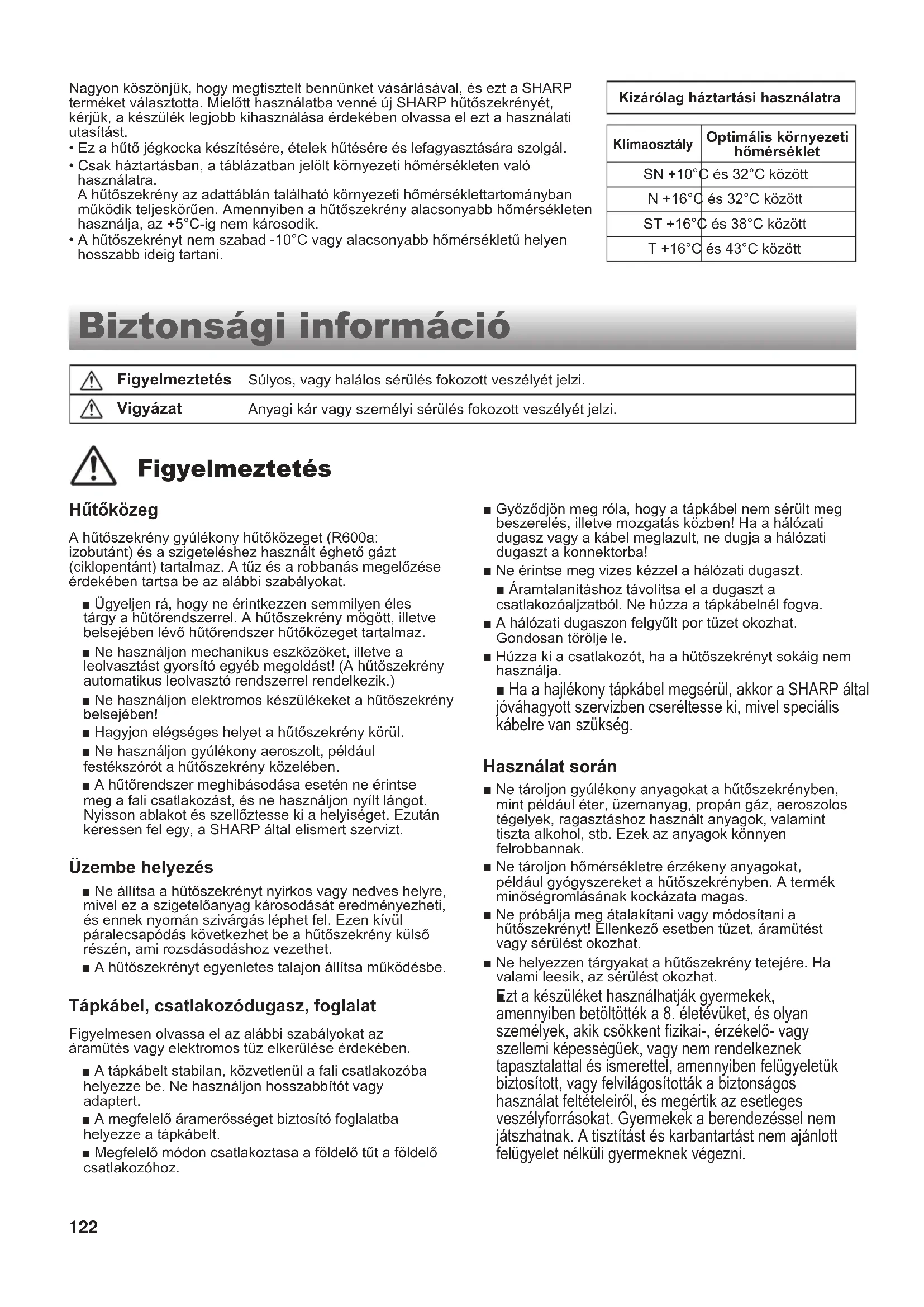 - A hűtőszekrényt nem szabad -10°C vagy alacsonyabb hőmérsékletű helyen hosszabb ideig tartani. Hűtőközeg A hűtőszekrény gyúlékony hűtőközeget (R600a: izobutánt) és a szigeteléshez használt éghető gázt (ciklopentánt) tartalmaz. A tűz és a robbanás megelőzése érdekében tartsa be az alábbi szabályokat. ■ Ügyeljen rá, hogy ne érintkezzen semmilyen éles tárgy a hűtőrendszerrel. A hűtőszekrény mögött, illetve belsejében lévő hűtőrendszer hűtőközeget tartalmaz. ■ Ne használjon mechanikus eszközöket, illetve a leolvasztást gyorsító egyéb megoldást! (A hűtőszekrény automatikus leolvasztó rendszerrel rendelkezik.) ■ Ne használjon elektromos készülékeket a hűtőszekrény belsejében! ■ Hagyjon elégséges helyet a hűtőszekrény körül. ■ Ne használjon gyúlékony aeroszolt, például festékszórót a hűtőszekrény közelében. ■ A hűtőrendszer meghibásodása esetén ne érintse meg a fali csatlakozást, és ne használjon nyílt lángot. Nyisson ablakot és szellőztesse ki a helyiséget. Ezután keressen fel egy, a SHARP által elismert szervizt. Üzembe helyezés ■ Ne állítsa a hűtőszekrényt nyirkos vagy nedves helyre, mivel ez a szigetelőanyag károsodását eredményezheti, és ennek nyomán szivárgás léphet fel. Ezen kívül páralecsapódás következhet be a hűtőszekrény külső részén, ami rozsdásodáshoz vezethet. ■ A hűtőszekrényt egyenletes talajon állítsa működésbe. Tápkábel, csatlakozódugasz, foglalat Figyelmesen olvassa el az alábbi szabályokat az áramütés vagy elektromos tűz elkerülése érdekében. ■ A tápkábelt stabilan, közvetlenül a fali csatlakozóba helyezze be. Ne használjon hosszabbítót vagy adaptert. ■ A megfelelő áramerősséget biztosító foglalatba helyezze a tápkábelt. ■ Megfelelő módon csatlakoztasa a földelő tűt a földelő csatlakozóhoz. ■ Győződjön meg róla, hogy a tápkábel nem sérült meg beszerelés, illetve mozgatás közben! Ha a hálózati dugasz vagy a kábel meglazult, ne dugja a hálózati dugaszt a konnektorba! ■ Ne érintse meg vizes kézzel a hálózati dugaszt. ■ Áramtalanításhoz távolítsa el a dugaszt a csatlakozóaljzatból. Ne húzza a tápkábelnél fogva. ■ A hálózati dugaszon felgyűlt por tüzet okozhat. Gondosan törölje le. ■ Húzza ki a csatlakozót, ha a hűtőszekrényt sokáig nem használja. ■ Ha a hajlékony tápkábel megsérül, akkor a SHARP által jóváhagyott szervizben cseréltesse ki, mivel speciális kábelre van szükség. Használat során ■ Ne tároljon gyúlékony anyagokat a hűtőszekrényben, mint például éter, üzemanyag, propán gáz, aeroszolos tégelyek, ragasztáshoz használt anyagok, valamint tiszta alkohol, stb. Ezek az anyagok könnyen felrobbannak. ■ Ne tároljon hőmérsékletre érzékeny anyagokat, például gyógyszereket a hűtőszekrényben. A termék minőségromlásának kockázata magas. ■ Ne próbálja meg átalakítani vagy módosítani a hűtőszekrényt! Ellenkező esetben tüzet, áramütést vagy sérülést okozhat. ■ Ne helyezzen tárgyakat a hűtőszekrény tetejére. Ha valami leesik, az sérülést okozhat.