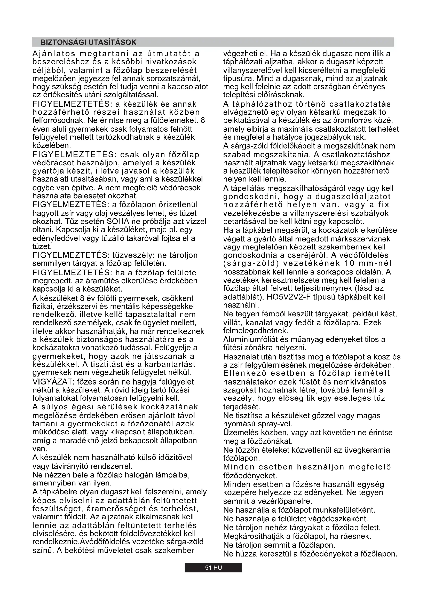 - - 1 8,7 kW (NG) 8,3 kW (LPG) 829 l/h 604 g/h 7,2 kW 686 l/h 524 g/h 9,45 kW 900 l/h 688 g/h 9,65 kW 920 l/h 702 g/h 10,45 kW 10,05 kW 996 l/h 731 g/h51 HU Ajánlatos megtartani az útmutatót a beszereléshez és a későbbi hivatkozások céljából, valamint a főzőlap beszerelését megelőzően jegyezze fel annak sorozatszámát, hogy szükség esetén fel tudja venni a kapcsolatot az értékesítés utáni szolgáltatással. FIGYELMEZTETÉS: a készülék és annak hozzáférhető részei használat közben felforrósodnak. Ne érintse meg a fűtőelemeket. 8 éven aluli gyermekek csak folyamatos felnőtt felügyelet mellett tartózkodhatnak a készülék közelében. FIGYELMEZTETÉS: csak olyan főzőlap védőrácsot használjon, amelyet a készülék gyártója készít, illetve javasol a készülék használati utasításában, vagy ami a készülékkel egybe van építve. A nem megfelelő védőrácsok használata balesetet okozhat. FIGYELMEZTETÉS: a főzőlapon őrizetlenül hagyott zsír vagy olaj veszélyes lehet, és tüzet okozhat. Tűz esetén SOHA ne próbálja azt vízzel oltani. Kapcsolja ki a készüléket, majd pl. egy edényfedővel vagy tűzálló takaróval fojtsa el a tüzet. FIGYELMEZTETÉS: tűzveszély: ne tároljon semmilyen tárgyat a főzőlap felületén. FIGYELMEZTETÉS: ha a főzőlap felülete megrepedt, az áramütés elkerülése érdekében kapcsolja ki a készüléket. A készüléket 8 év fölötti gyermekek, csökkent fizikai, érzékszervi és mentális képességekkel rendelkező, illetve kellő tapasztalattal nem rendelkező személyek, csak felügyelet mellett, illetve akkor használhatják, ha már rendelkeznek a készülék biztonságos használatára és a kockázatokra vonatkozó tudással. Felügyelje a gyermekeket, hogy azok ne játsszanak a készülékkel. A tisztítást és a karbantartást gyermekek nem végezhetik felügyelet nélkül. VIGYÁZAT: főzés során ne hagyja felügyelet nélkül a készüléket. A rövid ideig tartó főzési folyamatokat folyamatosan felügyelni kell. A súlyos égési sérülések kockázatának megelőzése érdekében erősen ajánlott távol tartani a gyermekeket a főzőzónától azok működése alatt, vagy kikapcsolt állapotukban, amíg a maradékhő jelző bekapcsolt állapotban van. A készülék nem használható külső időzítővel vagy távirányító rendszerrel. Ne nézzen bele a főzőlap halogén lámpáiba, amennyiben van ilyen. A tápkábelre olyan dugaszt kell felszerelni, amely képes elviselni az adattáblán feltüntetett feszültséget, áramerősséget és terhelést, valamint földelt. Az aljzatnak alkalmasnak kell lennie az adattáblán feltüntetett terhelés elviselésére, és bekötött földelővezetékkel kell rendelkeznie.Avédőföldelés vezetéke sárga-zöld színű. A bekötési műveletet csak szakember